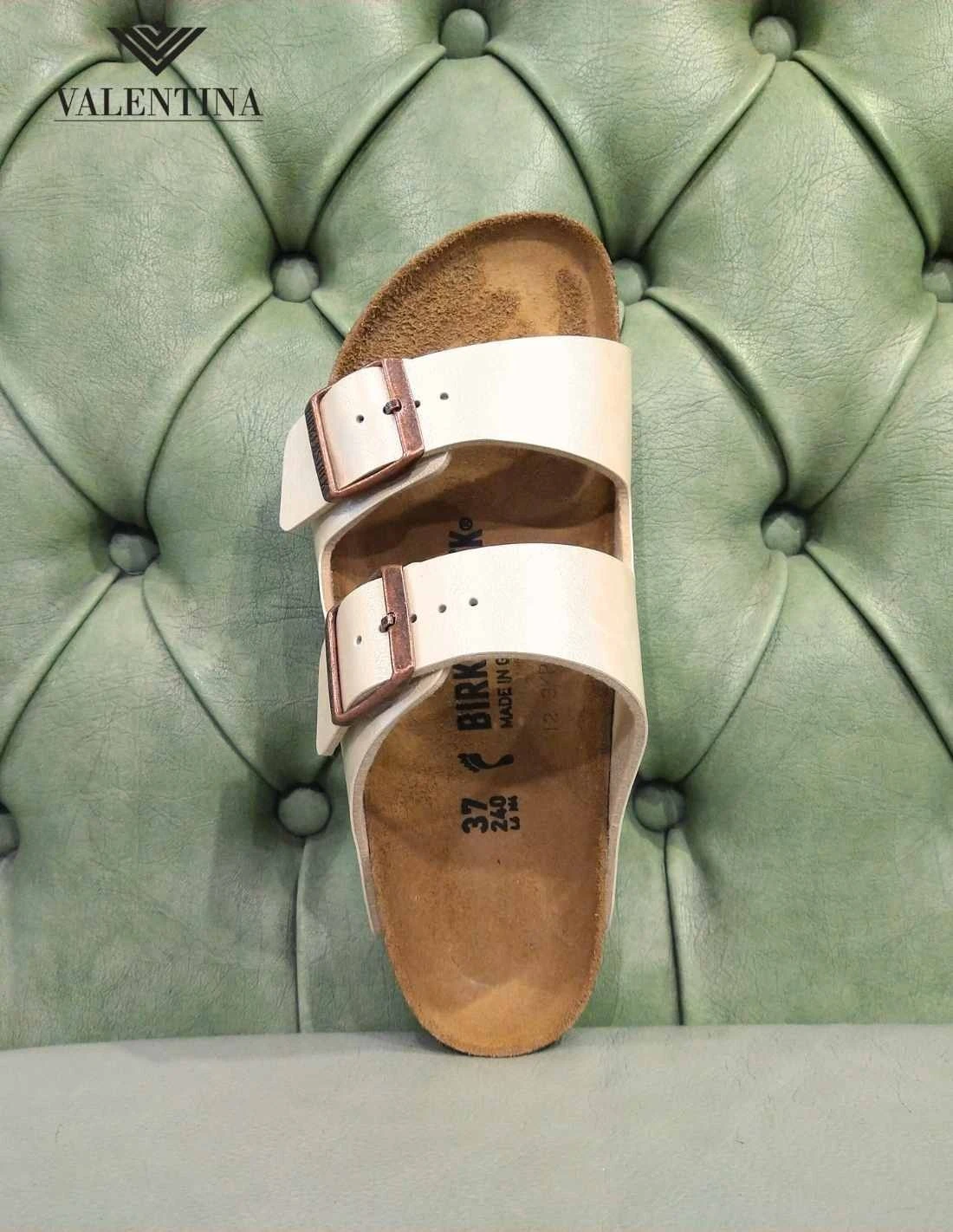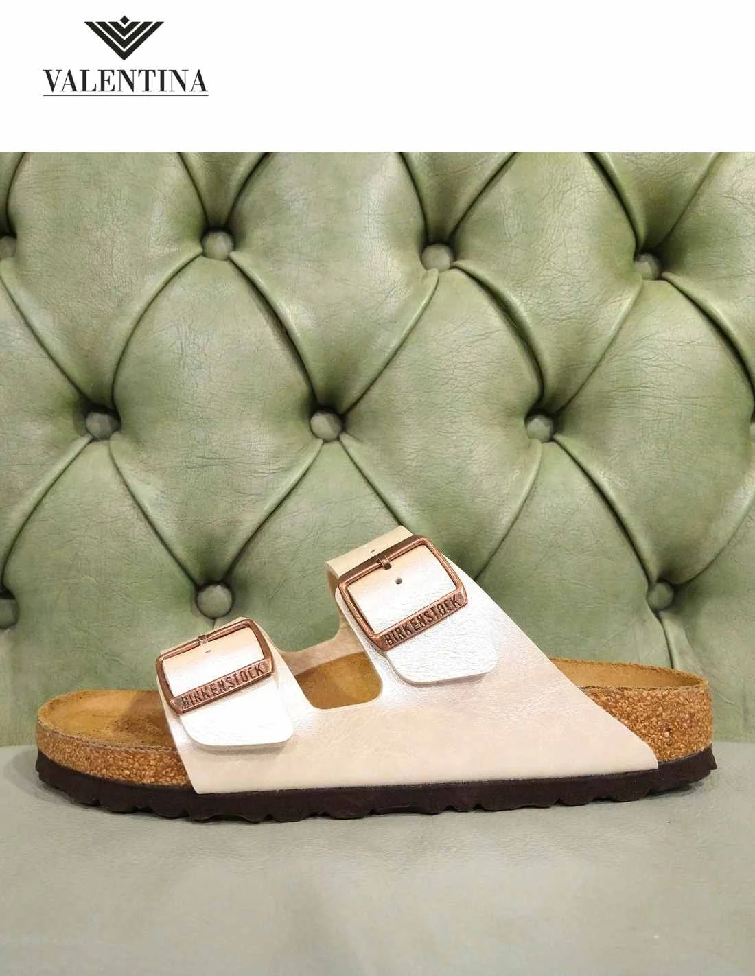 Sandali Birkenstock originali da donna, modello Arizona a doppia fascia, linea birko flor, cioè il materiale classico di Birkenstock amico della pelle, morbido e resistente. Qui proposti in bianco bianco perla e fibbia metallica color bronzo. La suola è in gomma nera. Plantare classico Birkenstock a calzata stretta (per piedi normali). Materiale birko flor.
