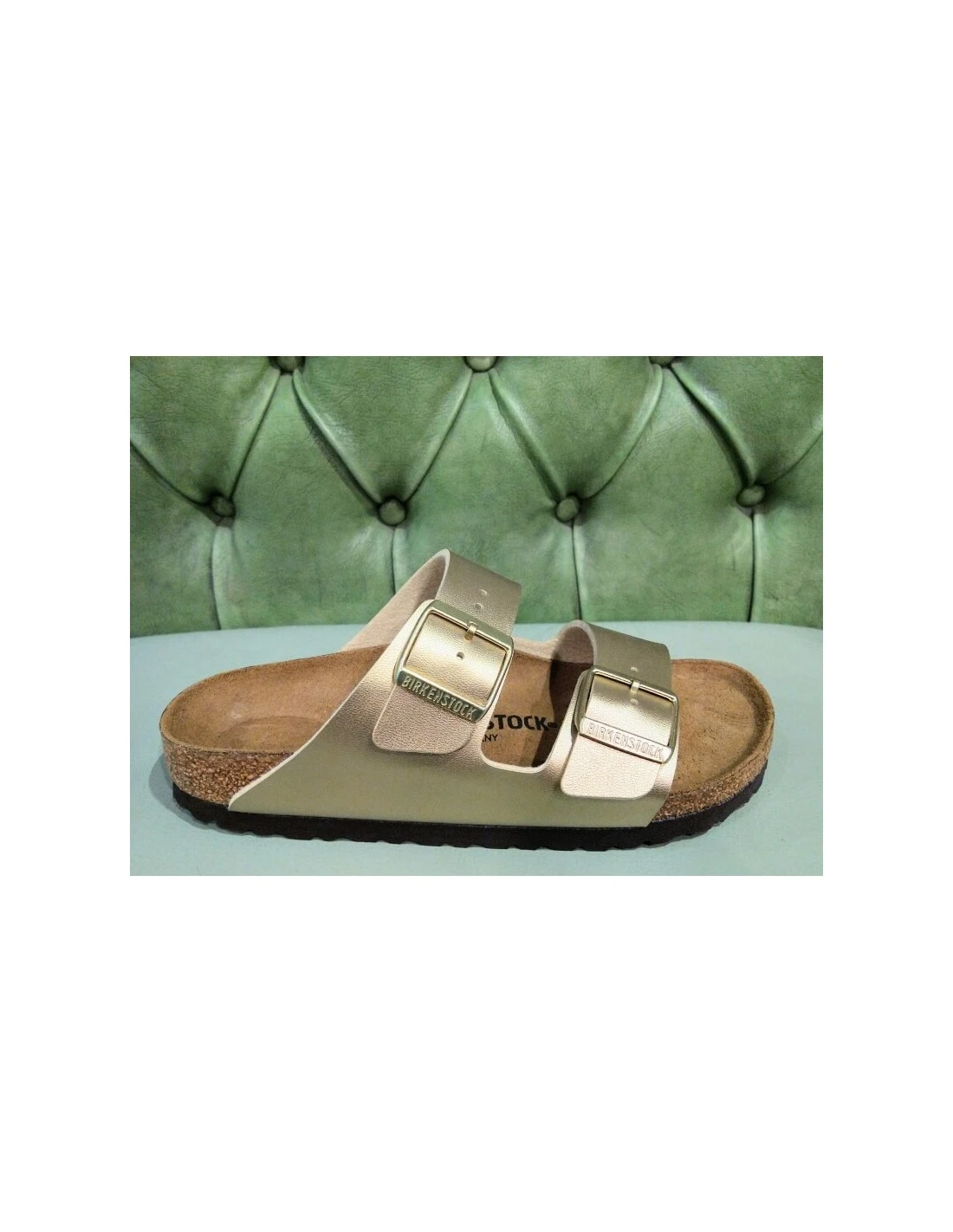 Sandali con doppio passante sul piede, modello Arizona Birkenstock. Fatti in birko flor, hanno un accattivante colore oro, perfetto per la stagione estiva. Plantare classico Birkenstock e calzata stretta.