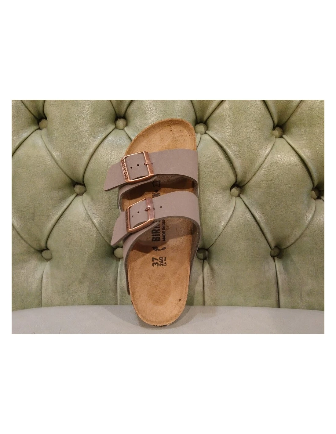 Calzata stretta, in birko flor nubuck, colore mocca. I sandali Arizona hanno un doppio passante sul piede, chiuso con cinturino metallico. Il sottopiede è quello classico in camoscio, dalla forma anatomica. La suola è in gomma EVA, extralight. La calzata è stretta.