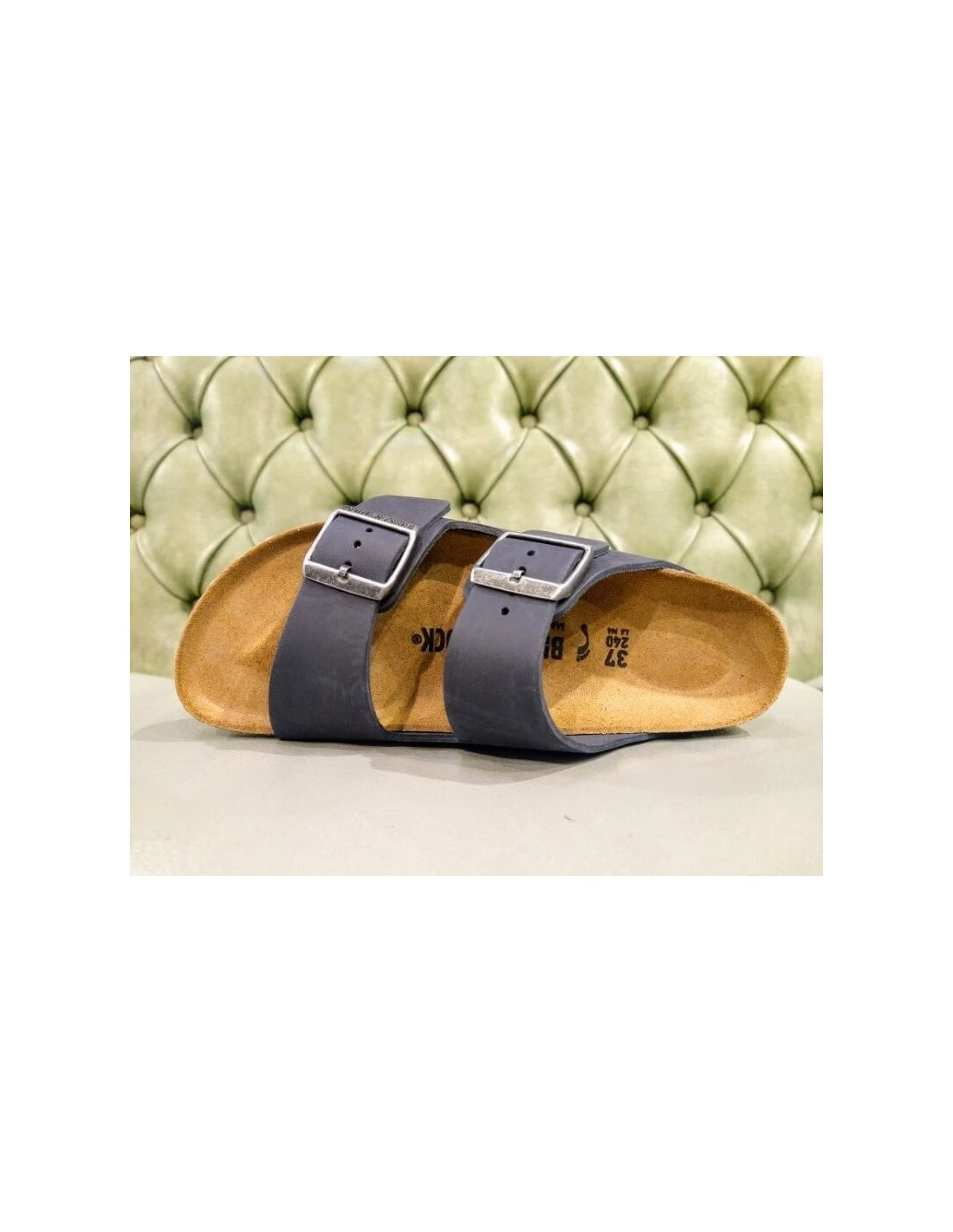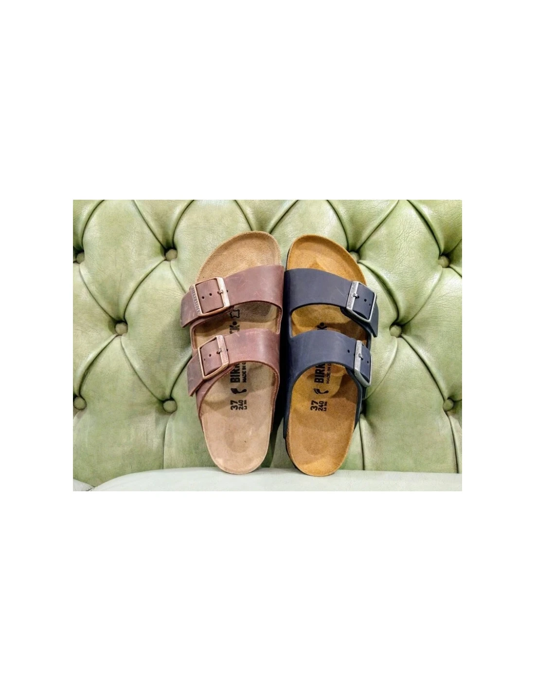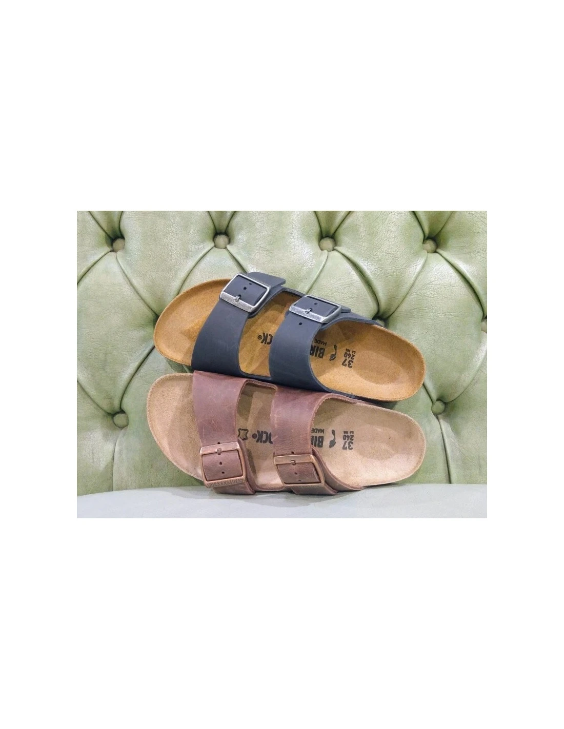 Sandali unisex uomo e donna, a doppia fascia. Birkenstock modello classico Arizona, calzata stretta, in vera pelle oliata. Colore nero con fibbie colore metallo. Disponibile anche marrone