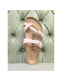 Sandali da donna Birkenstock modello Mayari colore soft pink, rosa tenue. La suola invece è in classica gomma nera. Calzata normale Birkenstock (adatta anche a piedi più larghi), footbed classico anatomico. Materiale pelle nubuck morbida e resistente, con fibbiette dorate.