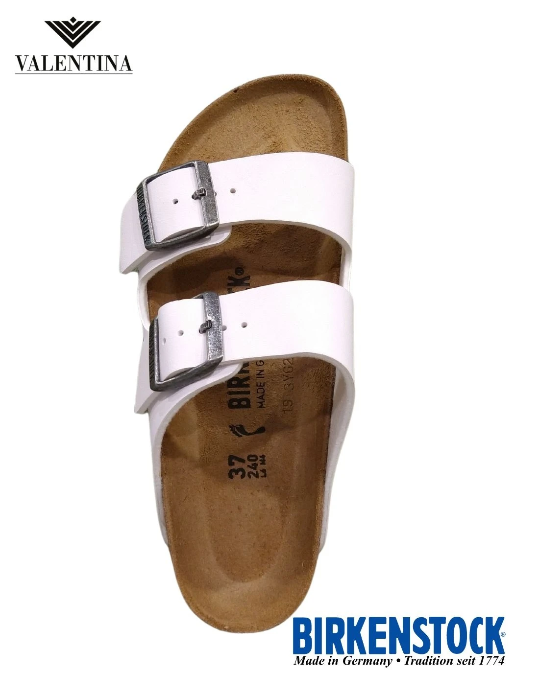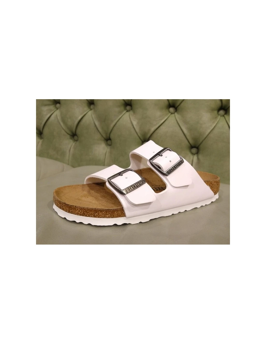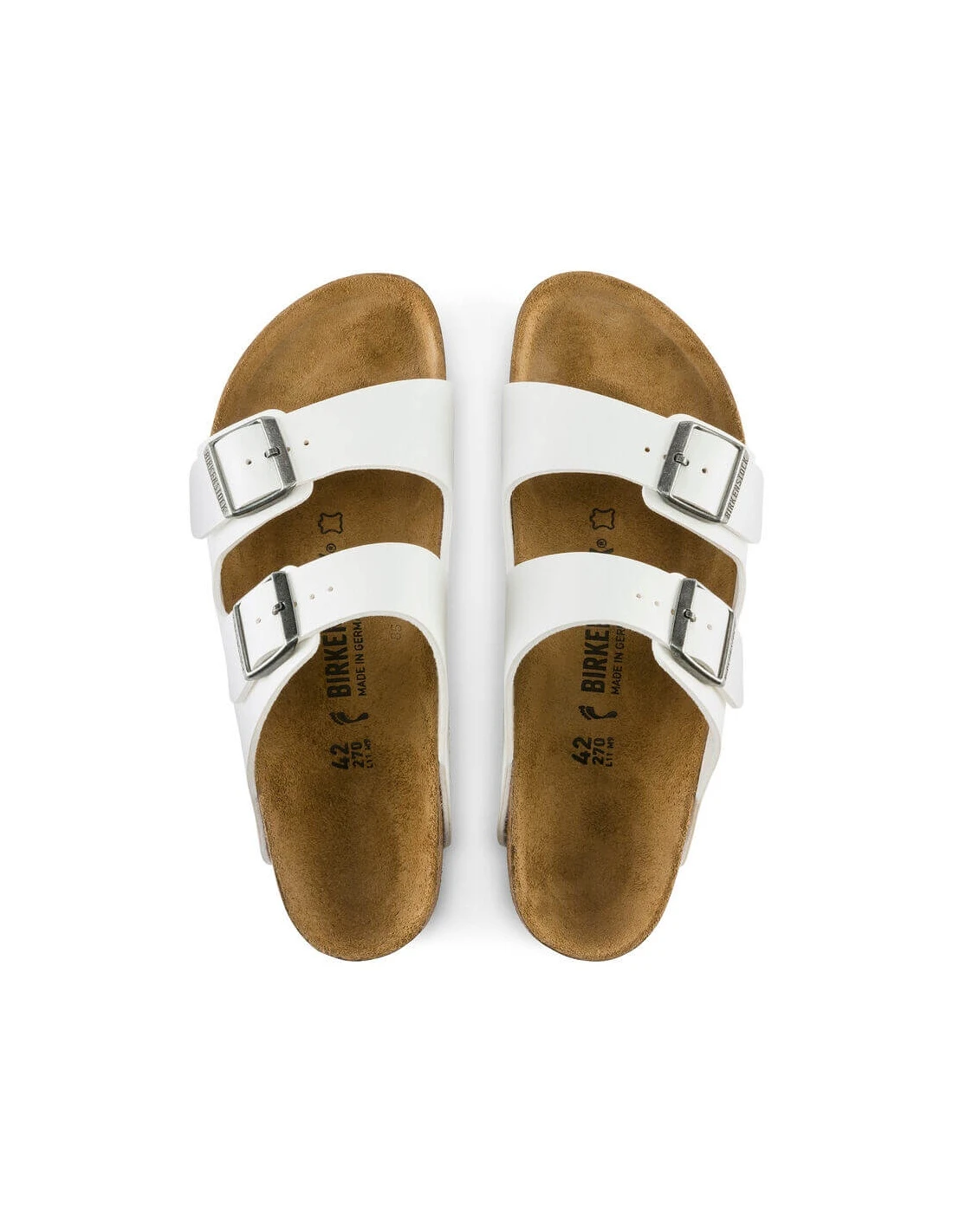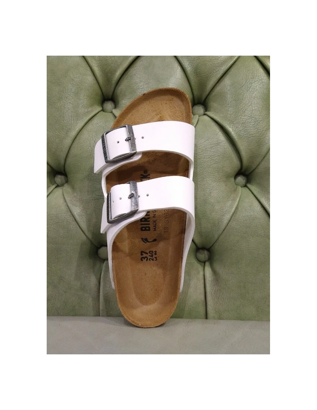 Sandali Birkenstock modelli classico Arizona a due fasce, colore bianco, con suola in gomma bianca. Variante in birko flor, il materiale Birkenstock dermoaffine e resistente. Versione classica con plantare anatomico e fibbie in colore metallo silver.