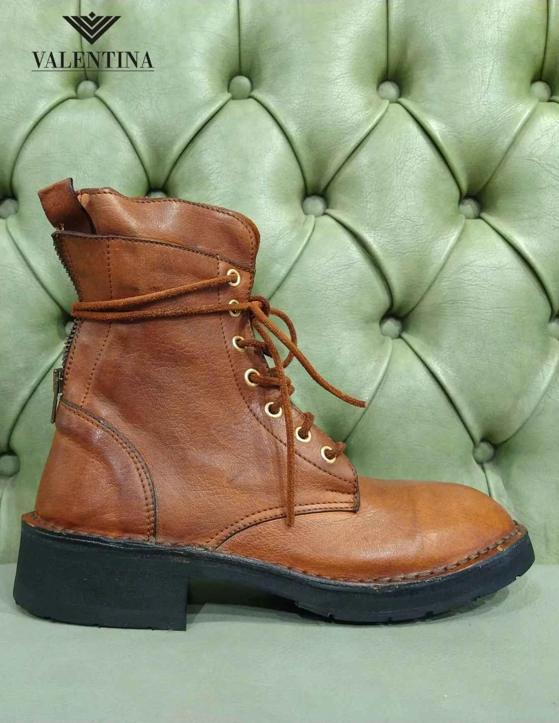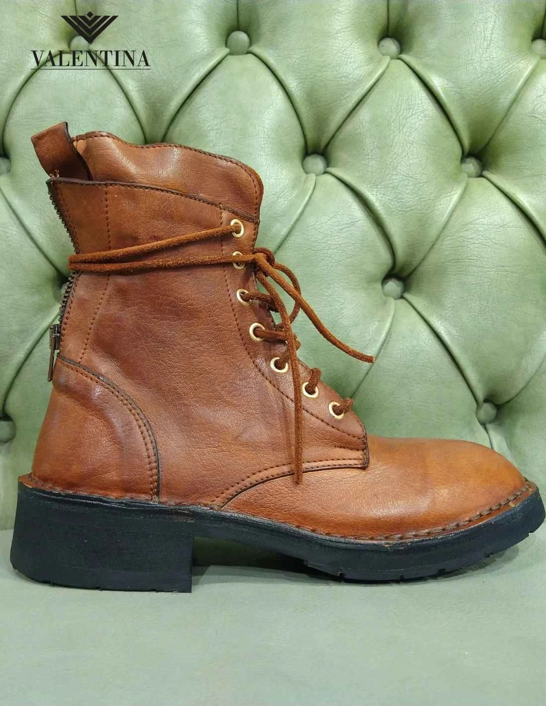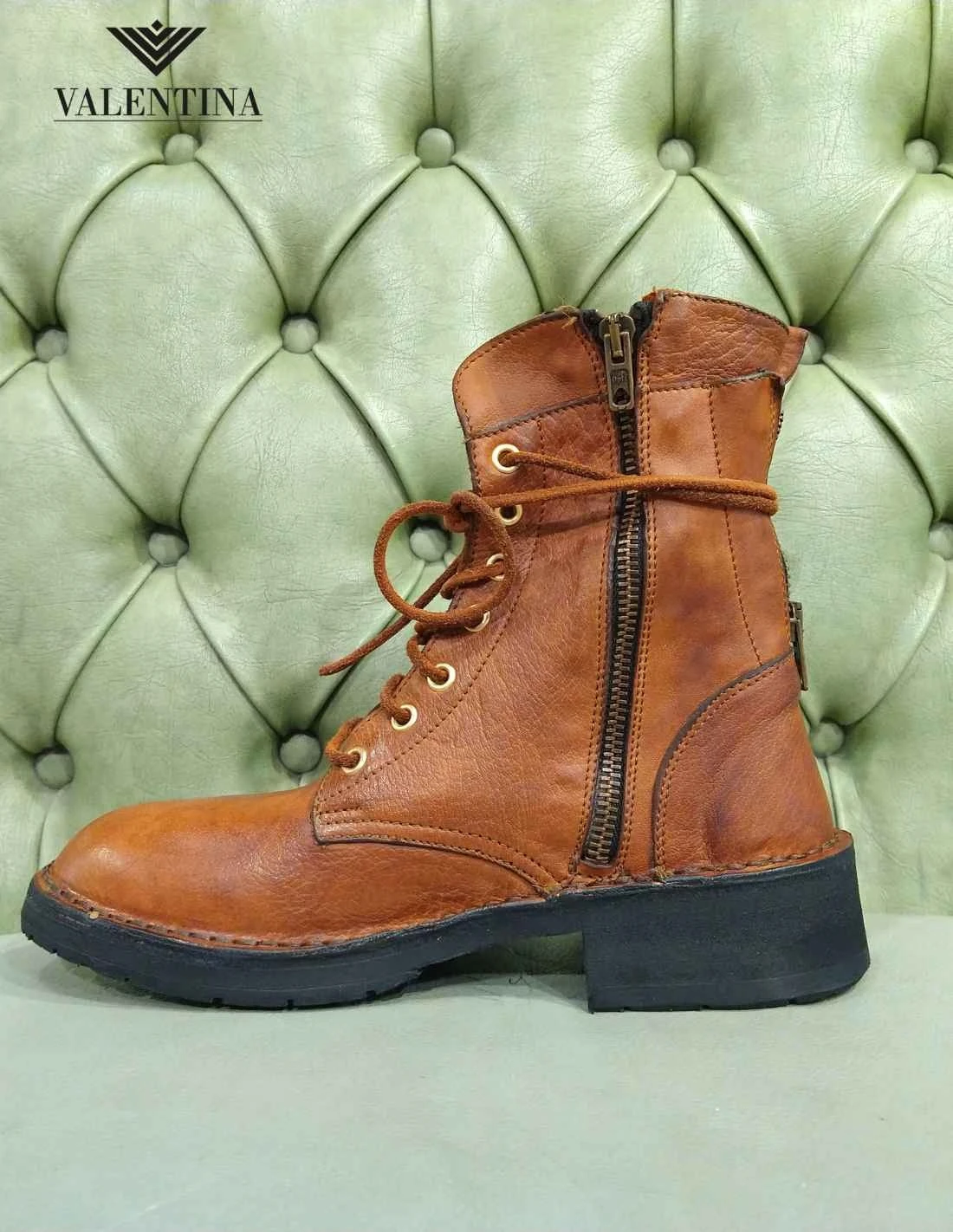Anfibi da donna morbidi in pelle premium lavorata a mano e colorata a mano con tecniche artigianali. Hanno un look vintage di pregio, sono chiusi da lacci e hanno la doppia cerniera sia sul lato che posteriore. Tacco basso e suola in gomma. Straordinariamente morbidi e molto di gusto. Abbinabili con abbigliamento grintoso.