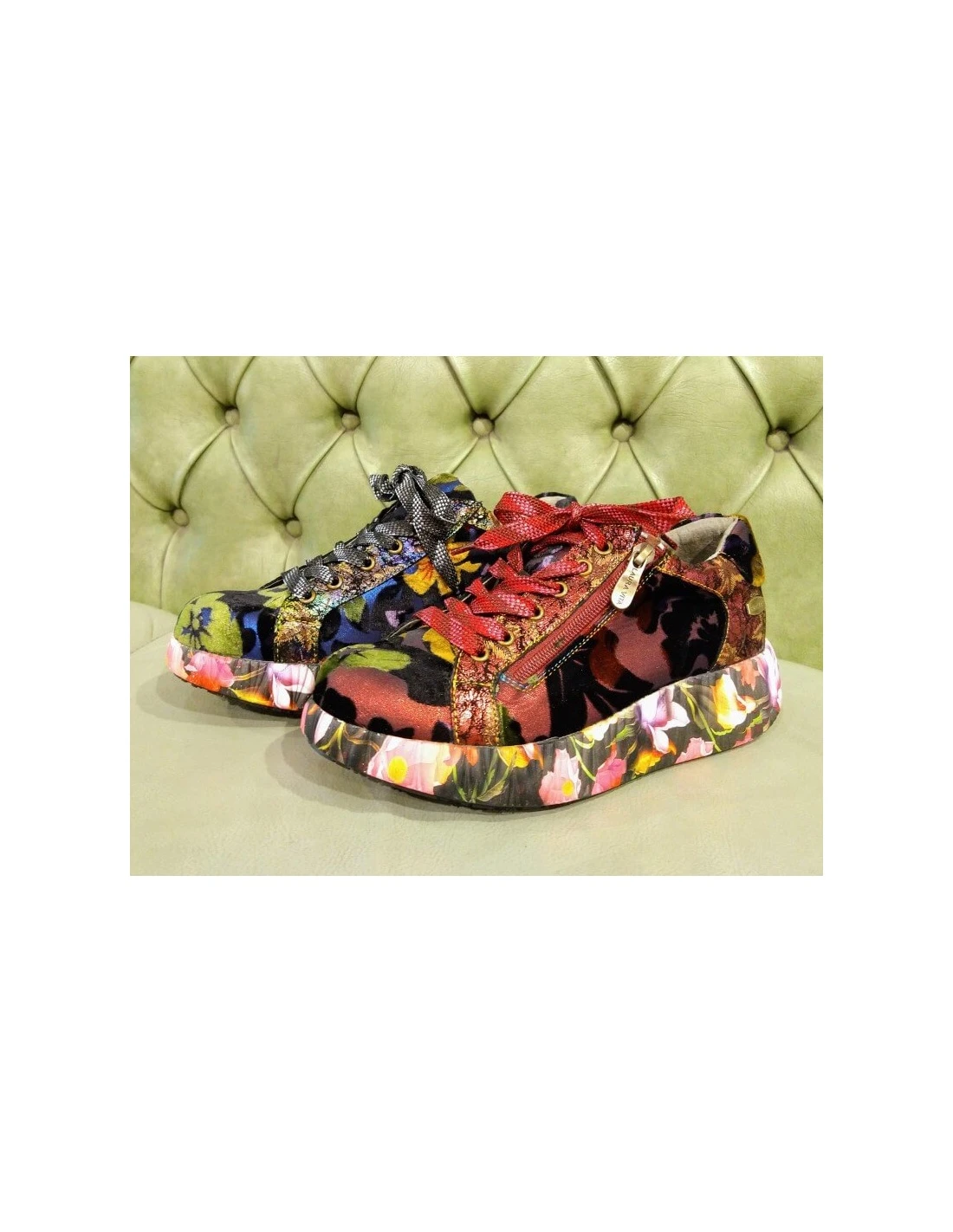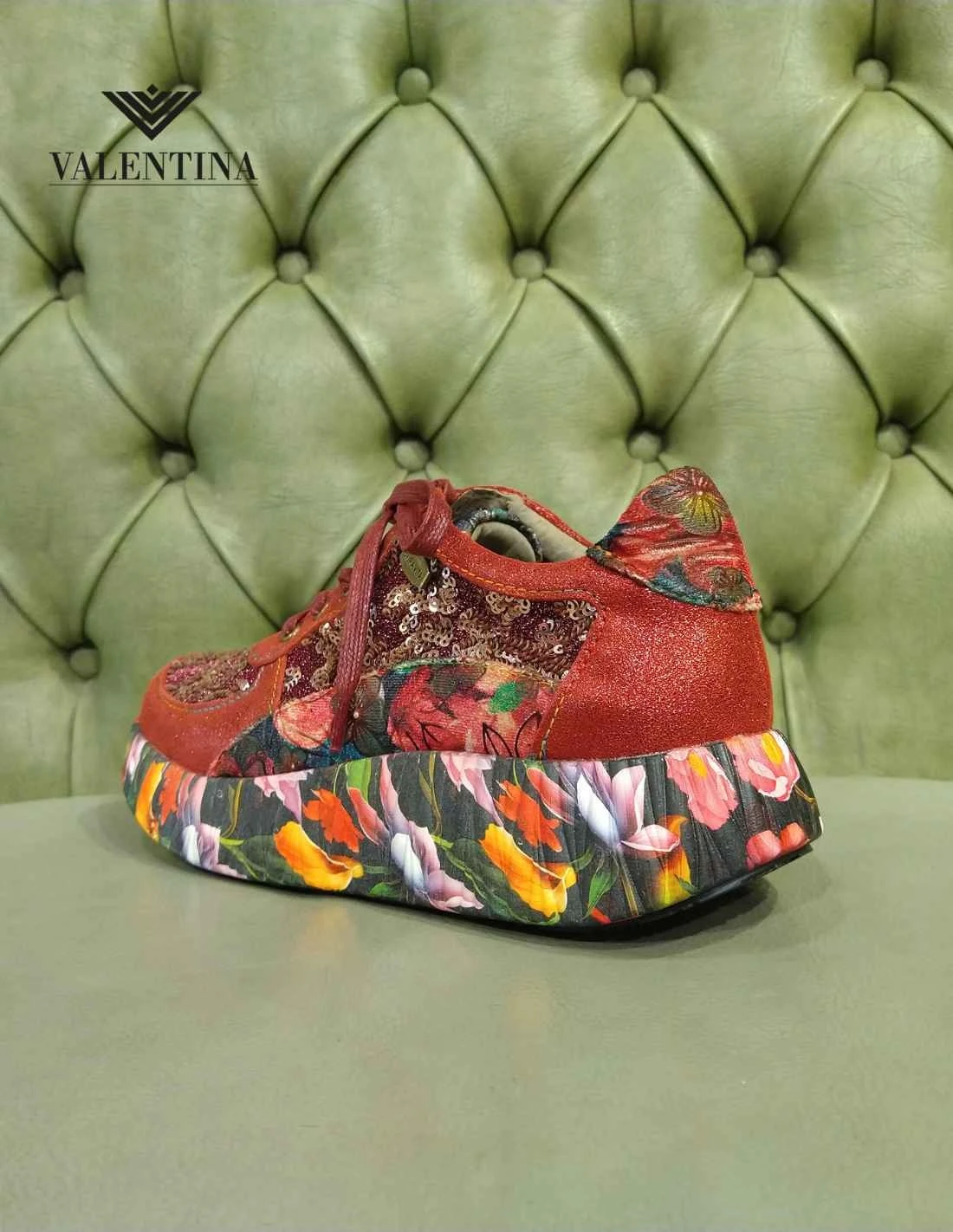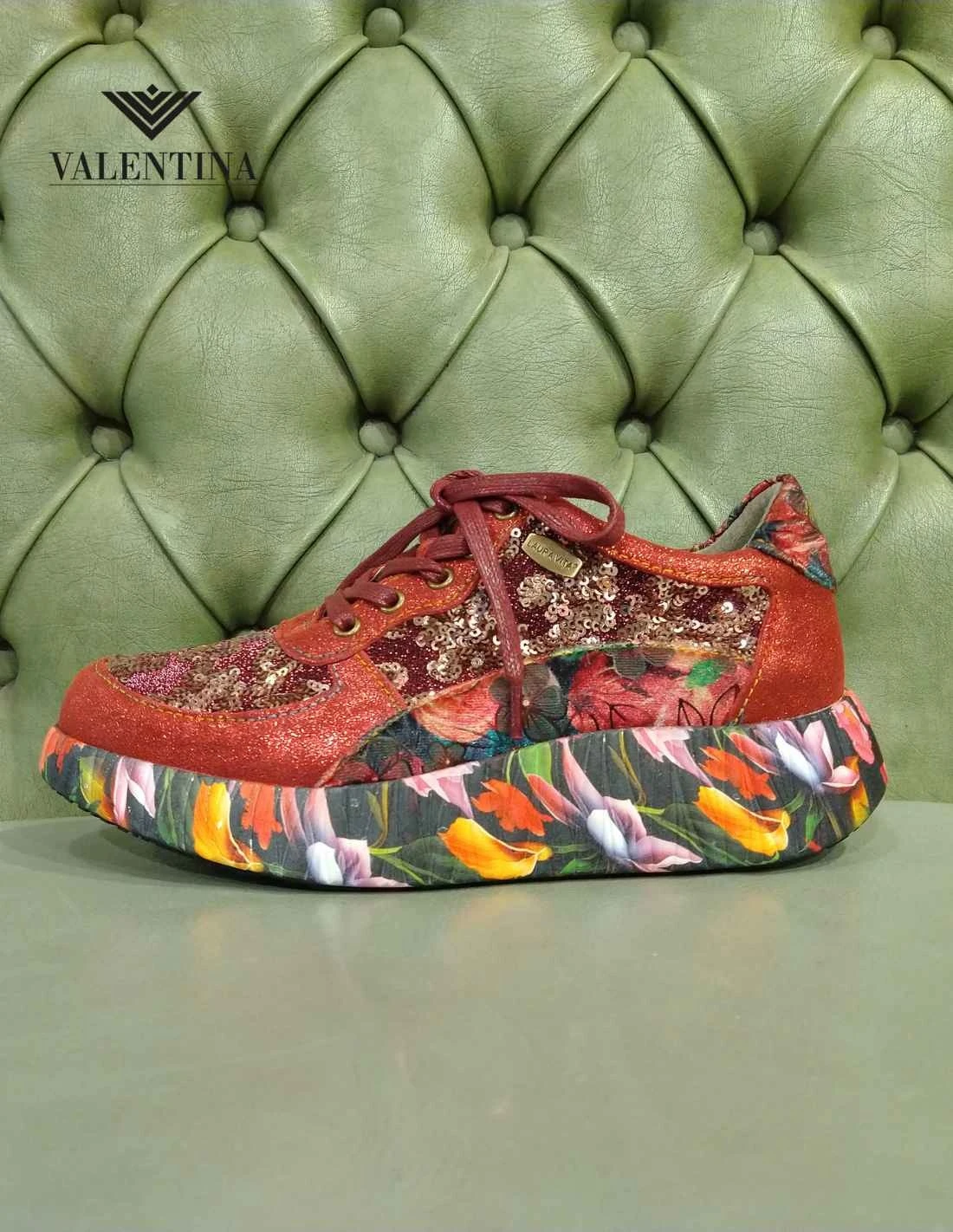 Stupende scarpe sneakers fashion da donna molto particolari, a fantasia floreale sul rosso. Le sneakers sono allacciata con lacci di raso, hanno anche un cerniera per essere indossate velocemente. Hanno una zeppa decorata a fiori.
