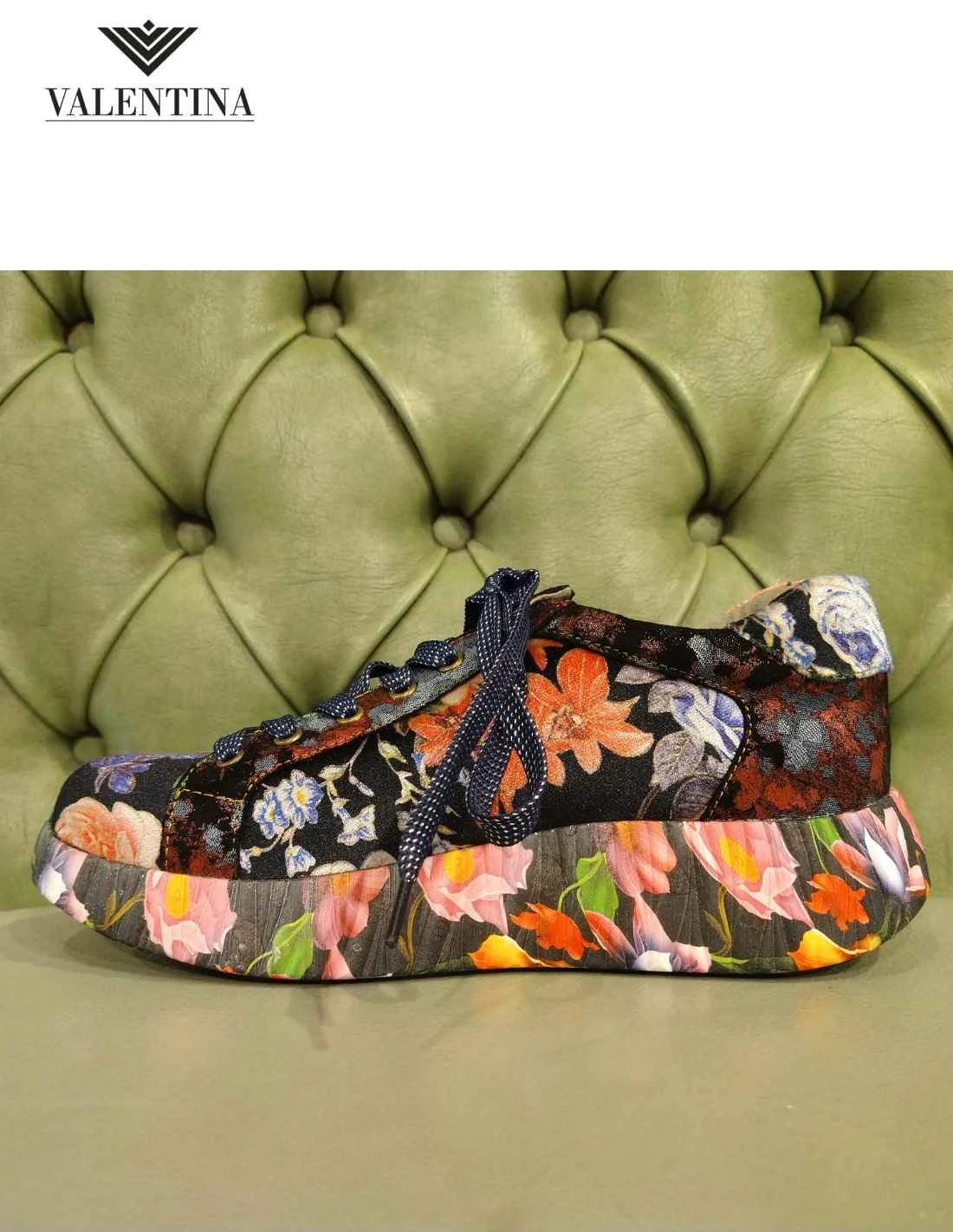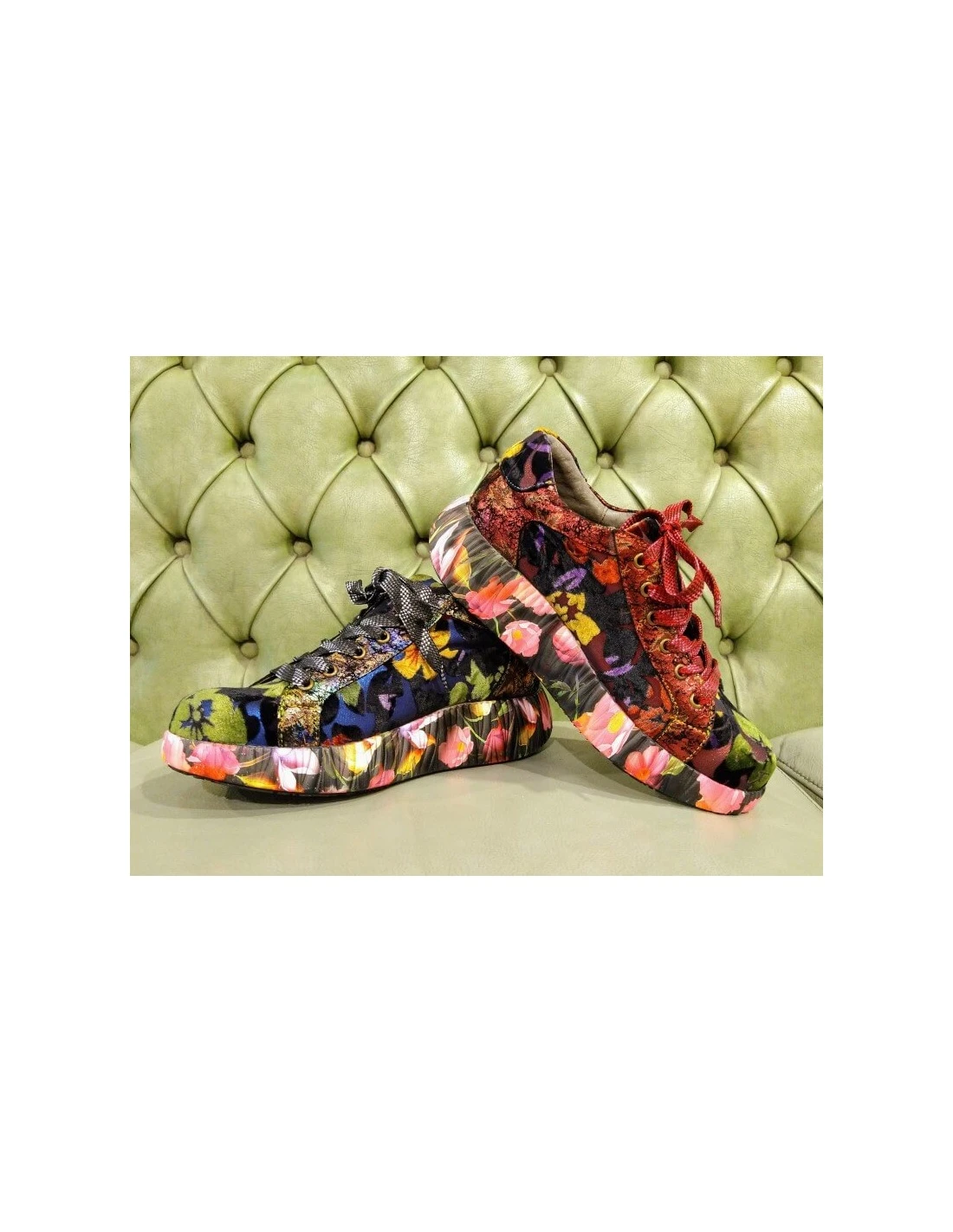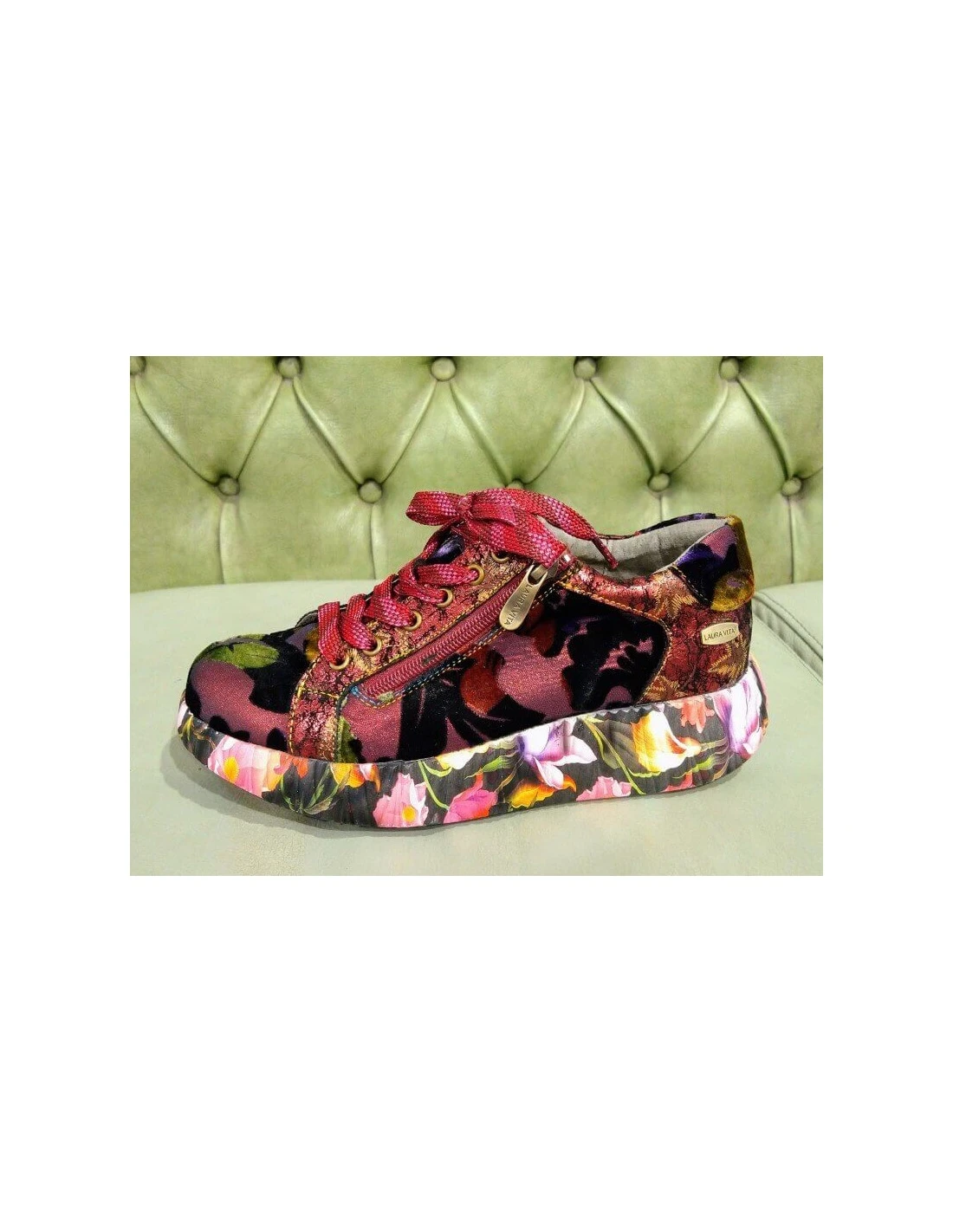 Stupende scarpe sneakers fashion da donna molto particolari, a fantasia floreale sul rosso. Le sneakers sono allacciata con lacci di raso, hanno anche un cerniera per essere indossate velocemente. Hanno una zeppa decorata a fiori.