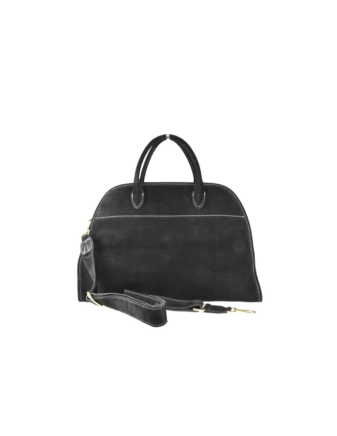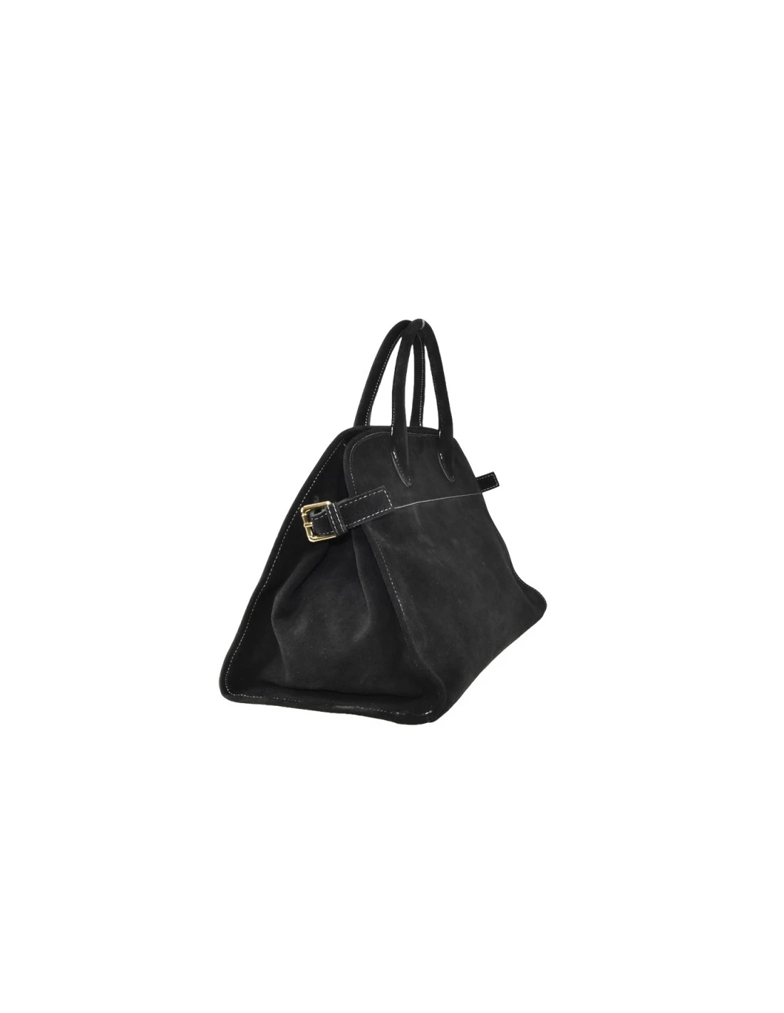 Borsa trapezio in pelle scamosciata. In struttura semirigida, ha la forma a trapezio non soltanto nei fianchi ma anche i profondità. Con manici per essere portata come borsa a mano, ha la chiusra con cerniera laterale e due fibbie laterali. Unico compartimento interno foderato in tessuto e taschino laterale con cerniera. Dimensioni 41x29x23