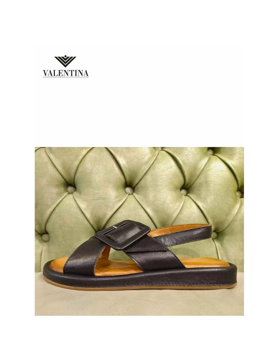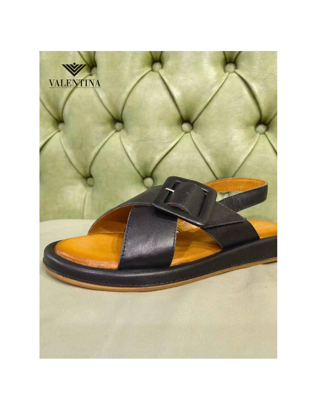 Sandali da donna con fasce in pelle incrociate sul piede e fermate da fibbia grande e decorativa. Hanno un passante dietro al piede per fermarle meglio. Sottopiede imbottito e dettaglio in pelle sul borodo della suola. I sandali sono disponibili colore nero oppure sabbia.