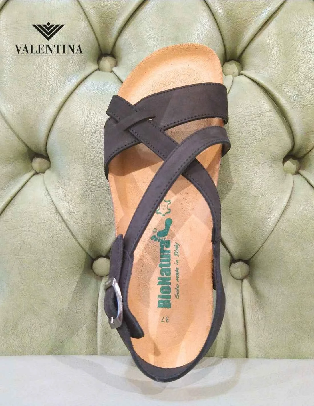 Calzature estive in pelle di nabuk, chiuse con fibbietta alla caviglia. Sandali incrociati, con zeppina di 4 cm in sughero, anatomica. Bionatura: calzature con tomaia in vera pelle, plantare anatomico e accessori Nikel Free. Disponibili colore nero o tortora