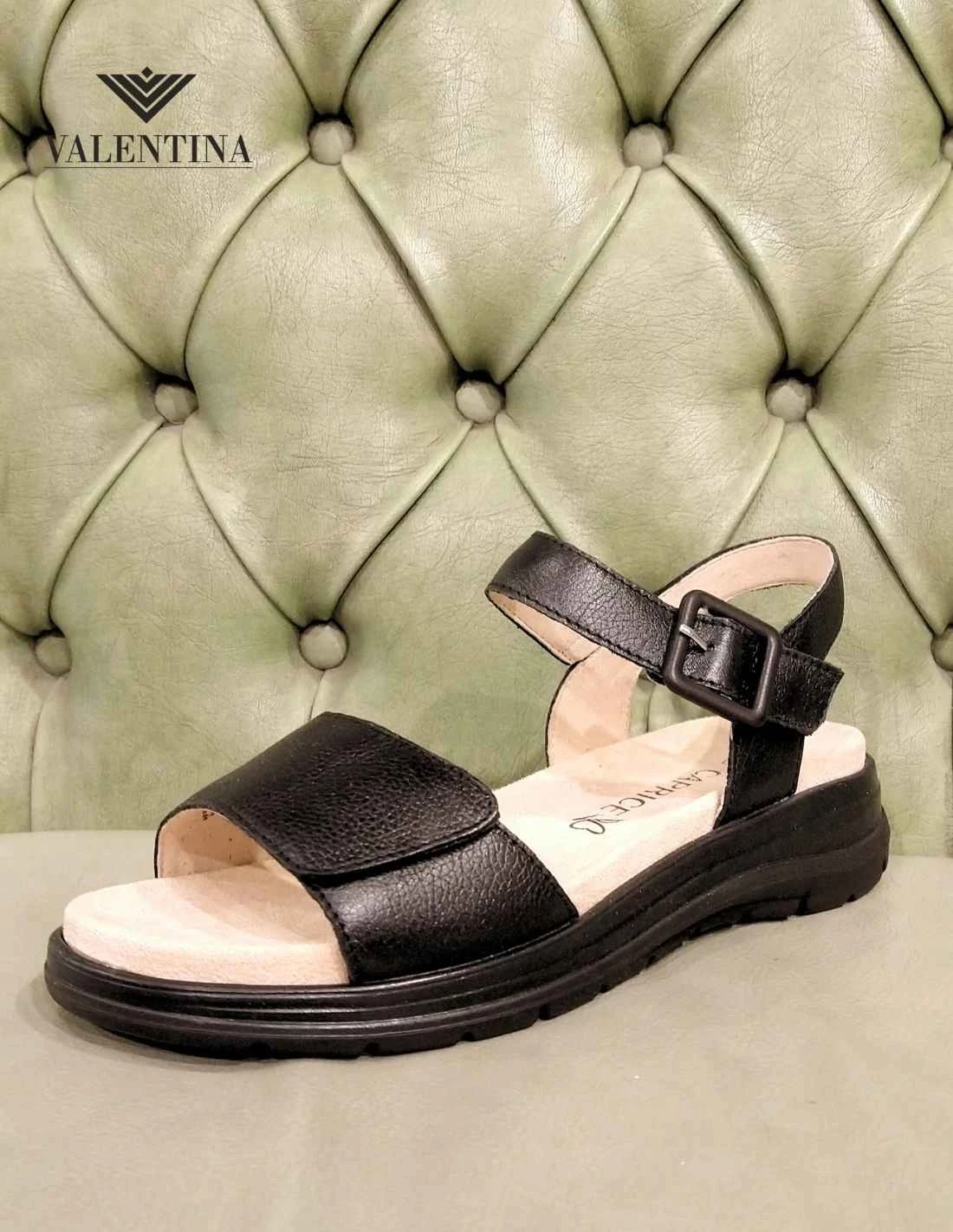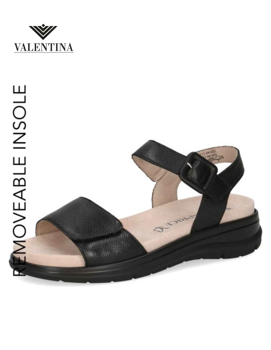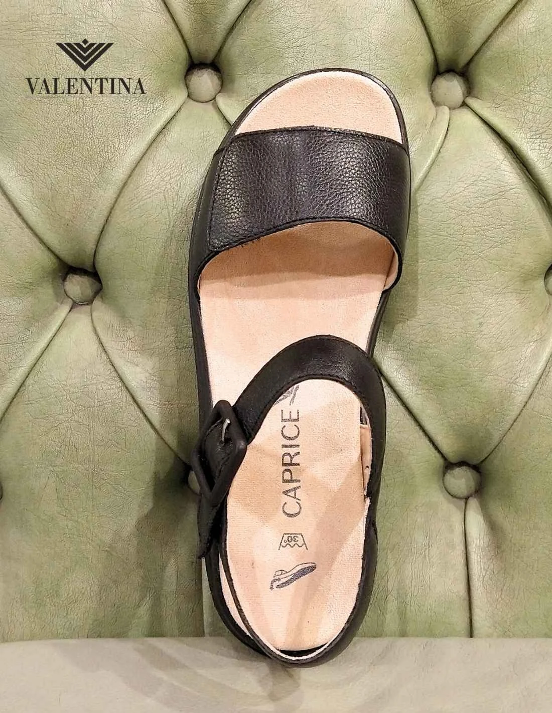 Sandali da donna marca Caprice per l’estate 2025. Sandali in pelle morbida nappata, colore nero o bianco crema perlato. I sandali hanno una zeppa comoda alta 4 cm, in colore nero o bianco perla. Fermati da passante con velcro sul piede e da fibbia alla caviglia. Hanno il sottopiede morbido e comodo ed estraibile.