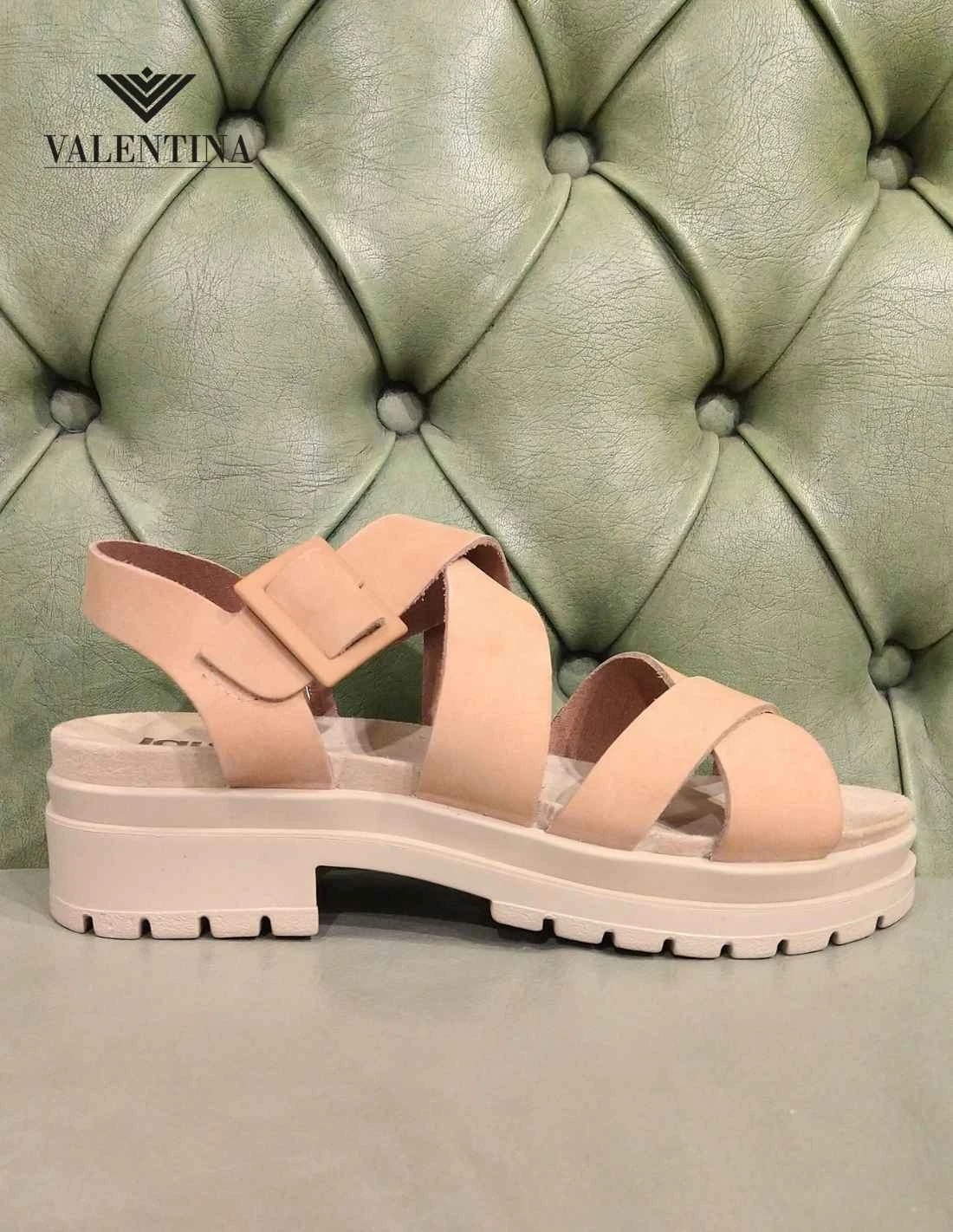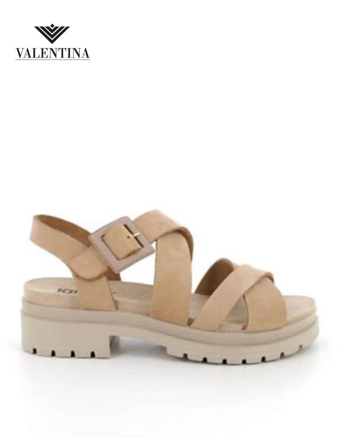 Sandali da donna maed in Italy, marca Igi&Co. Molto comodi, con una suola carrarmata molto di moda. Struttura a gabbietta in pelle color beige oppure militare, arricchiata da fibbie grosse quadrate in tono su tono. Chiusura con fibbietta alla caviglia. Disponibili beige oppure verde militare. Tacco comodo 5 cm e plateau 3 cm.