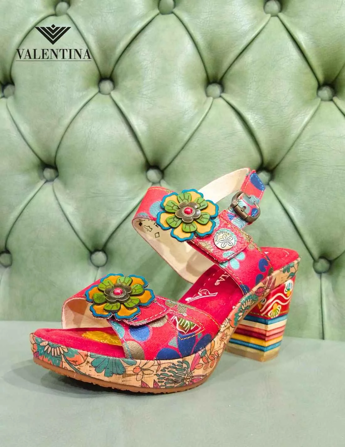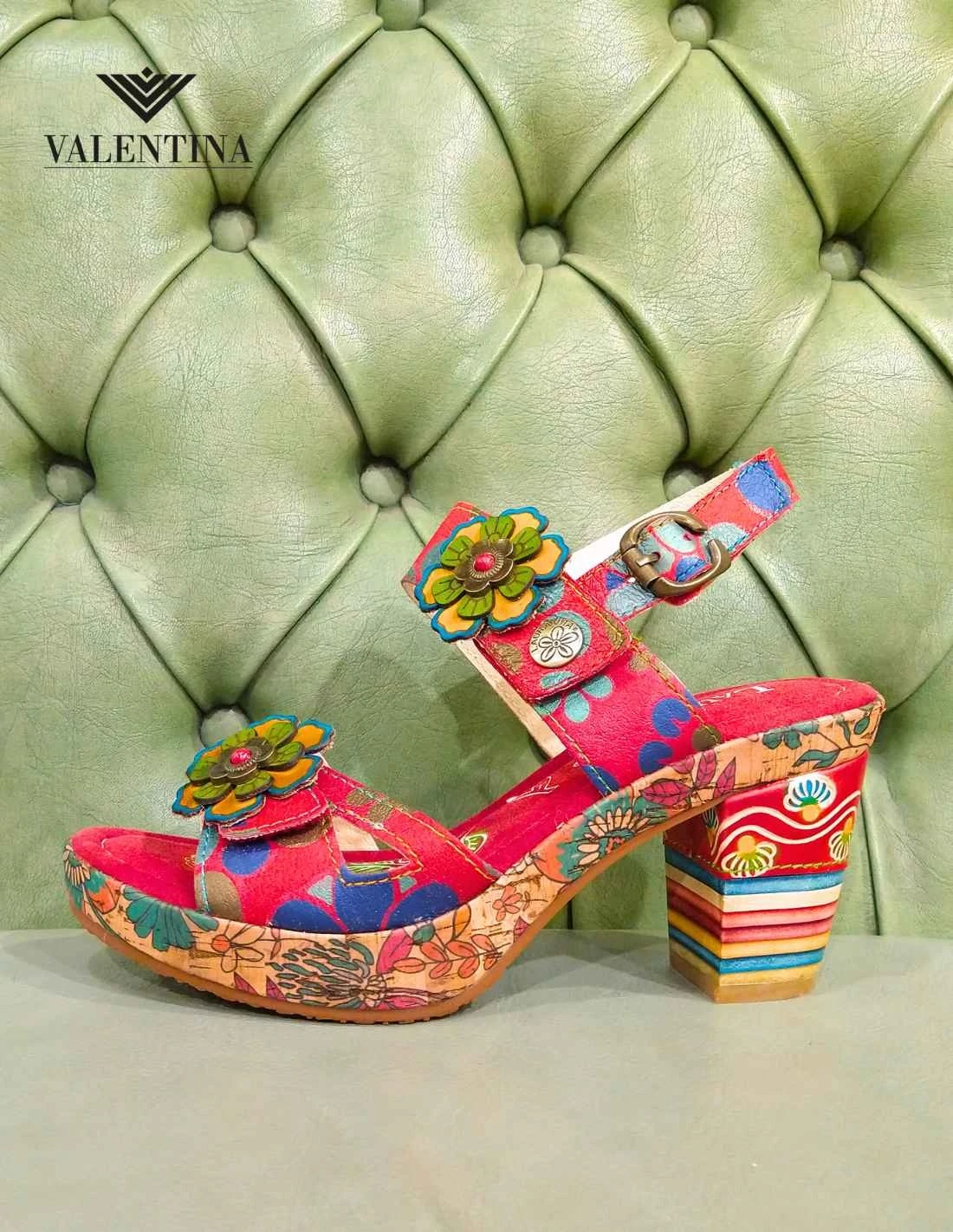 Sandali Laura Vita da donna, con tacco 8 cm e plateau di 2 cm. Il tacco è decorato in stile Laura Vita, e ha la forma conica larga, molto stabile. Look trendy in bellissima pelle morbida dal colore variegato ricco. I sandali hanno un passante sul piede chiuso da velcro strap e due passanti alla caviglia, di cui uno chiuso con strap e l’altro con cinturino metallico. Il plantare è morbido e imbottito, molto comodo. Disponibili colore rosso oppure beige