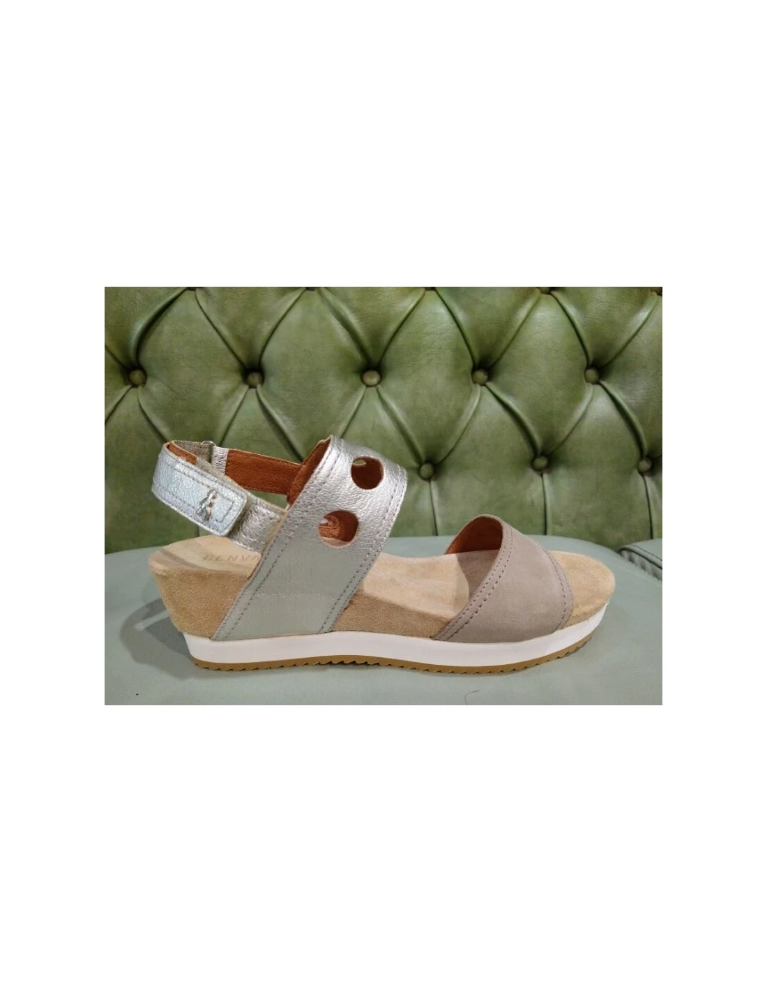 Sandali da donna, linea molto comoda e bella, adatti anche per l’ufficio. In pelle morbida color sabbia e argento. Con pasante dietro alla caviglia chiuso a strappo. Zeppa altezza media. Comfort e stile