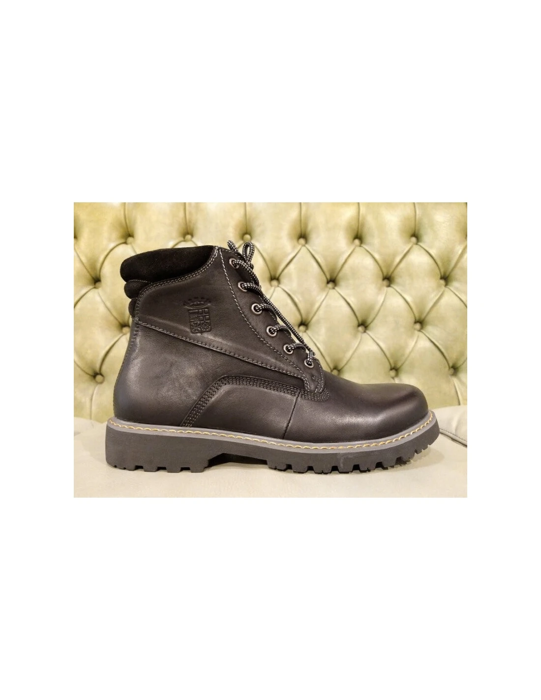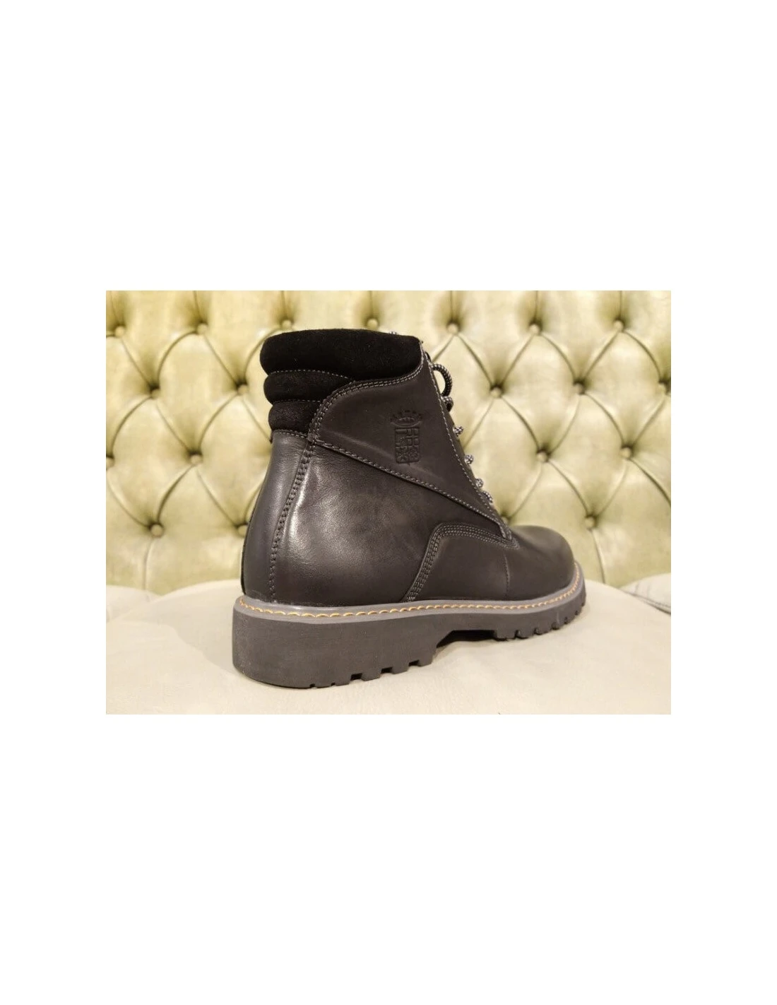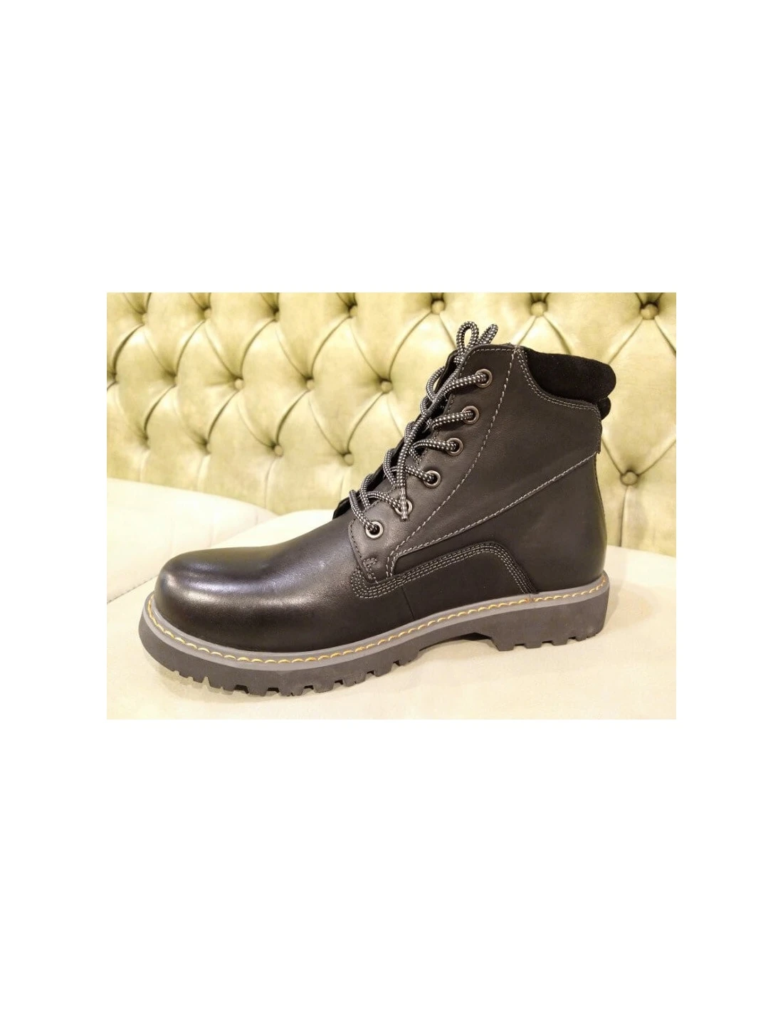Marina Militare scarpe anfibi da uomo, in vera pelle nera, con allacciatura alta fino alla caviglia. La suola è in gomma carrarmata grigia, ed ha il tacco basso. Resistenti all’acqua.