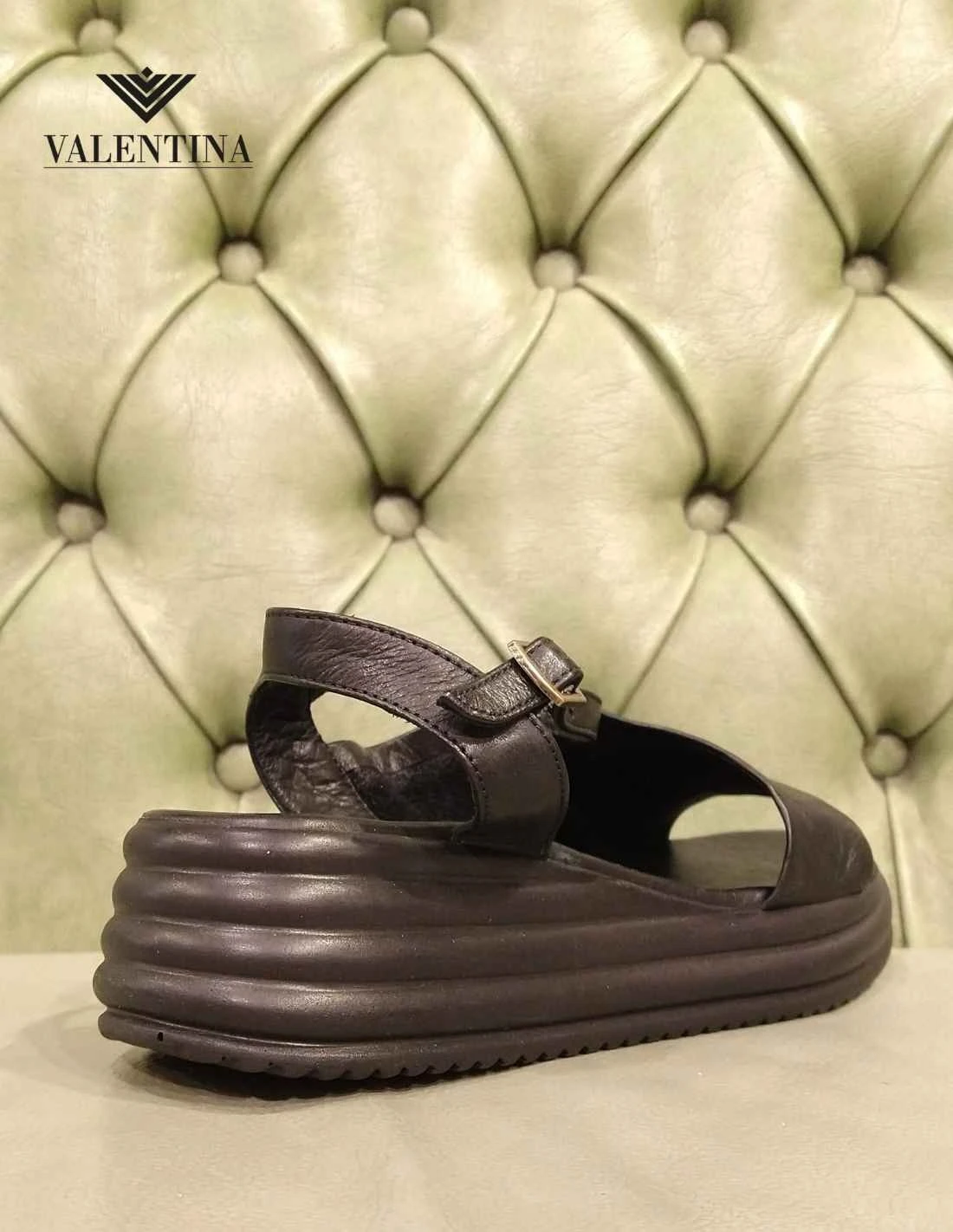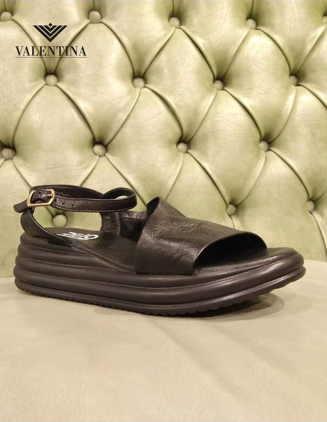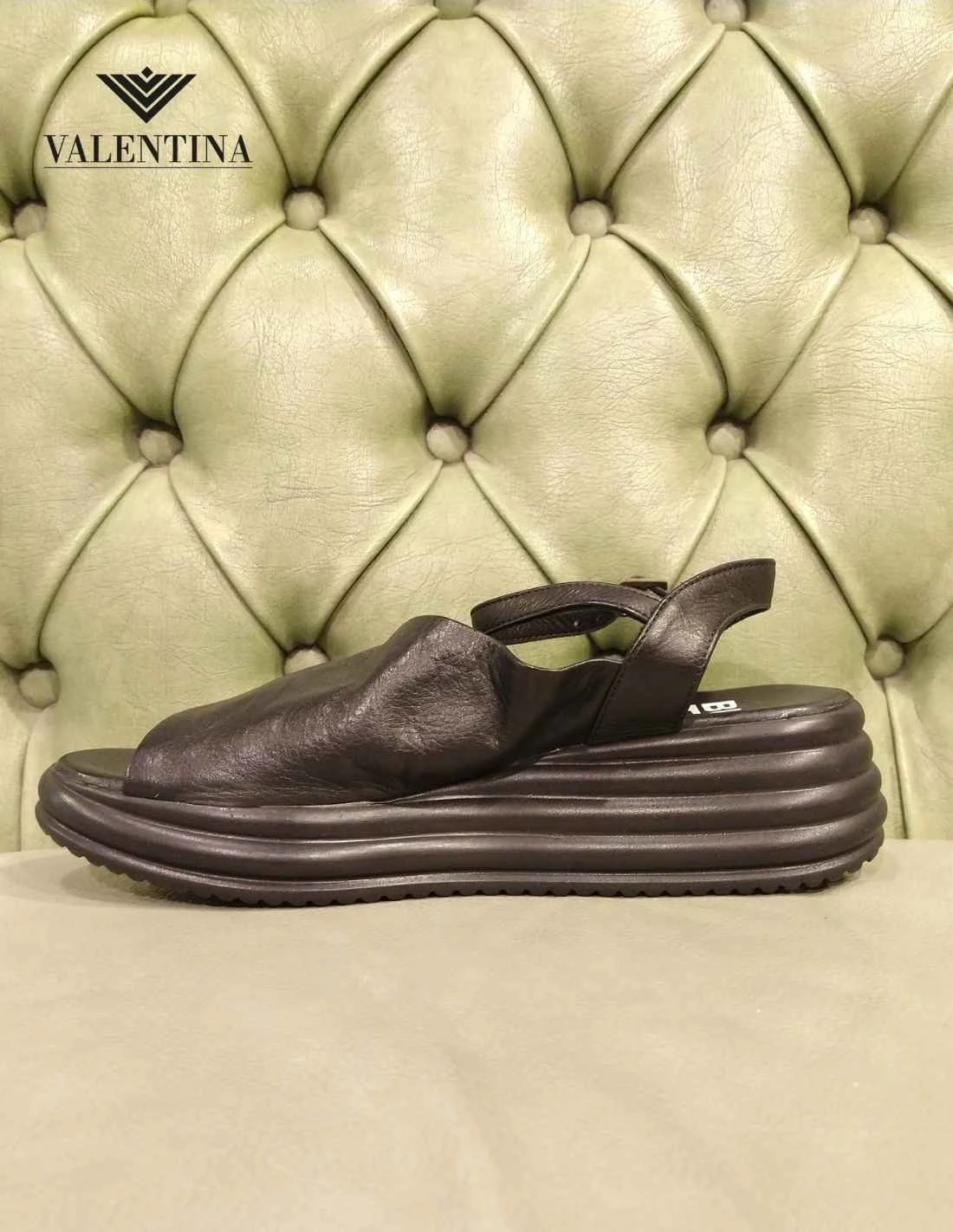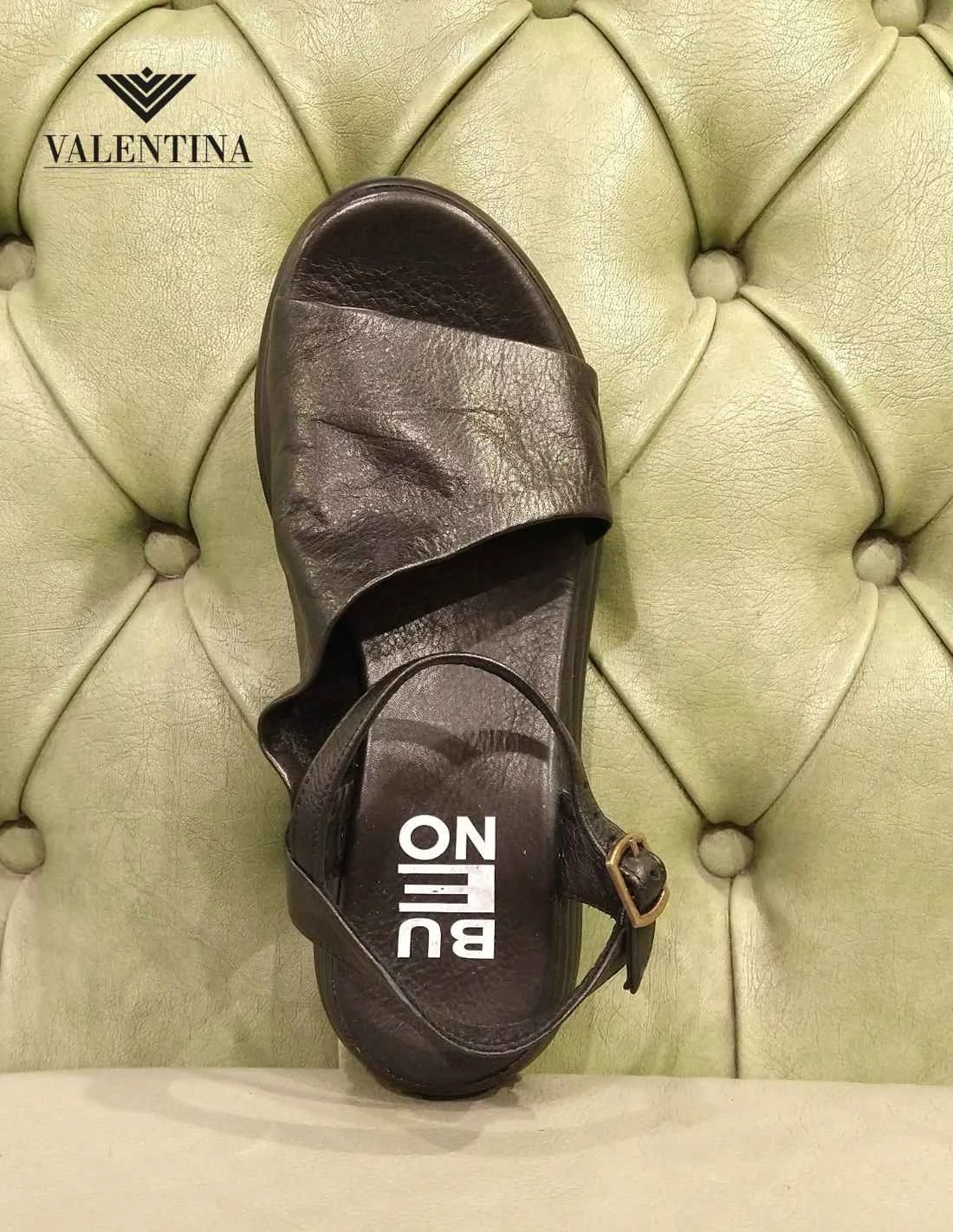 Scarpe estive marca Bueno. Sandali aperti davanti e dietro, in pelle molto morbida colorata in nero. Le scarpe hanno un cinturino alla caviglia. Zeppa alta 5 cm al tallone, suola in gomma e sottopiede in pelle. Una scarpa fresca, frizzante e moderna, oltre che comoda e di buon prezzo.