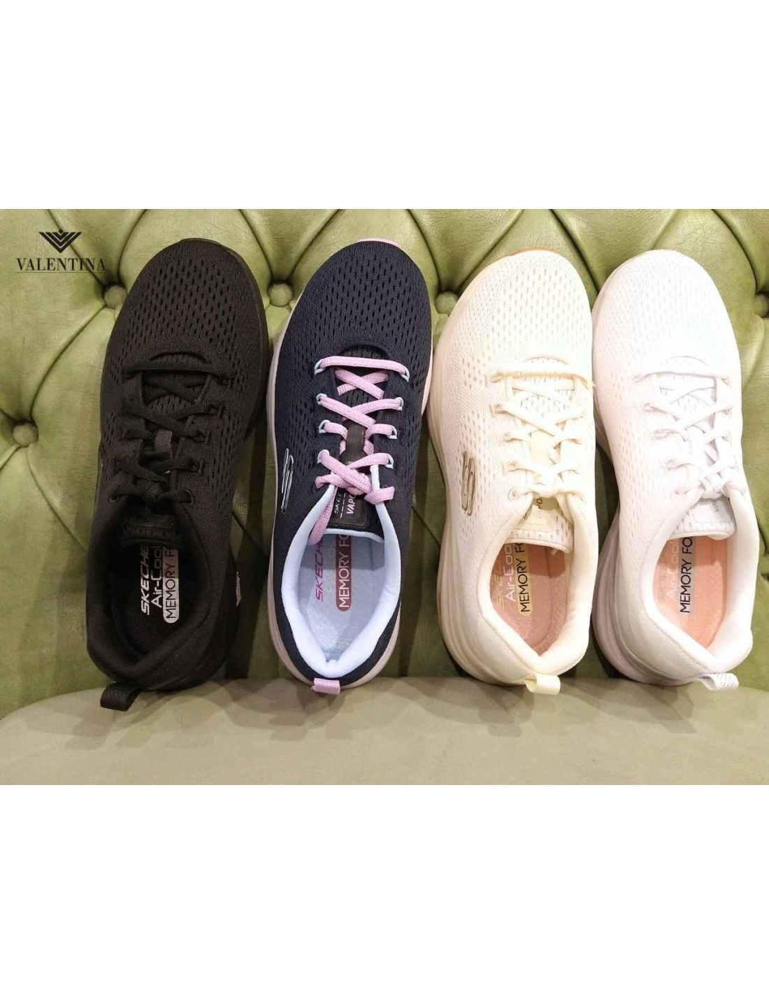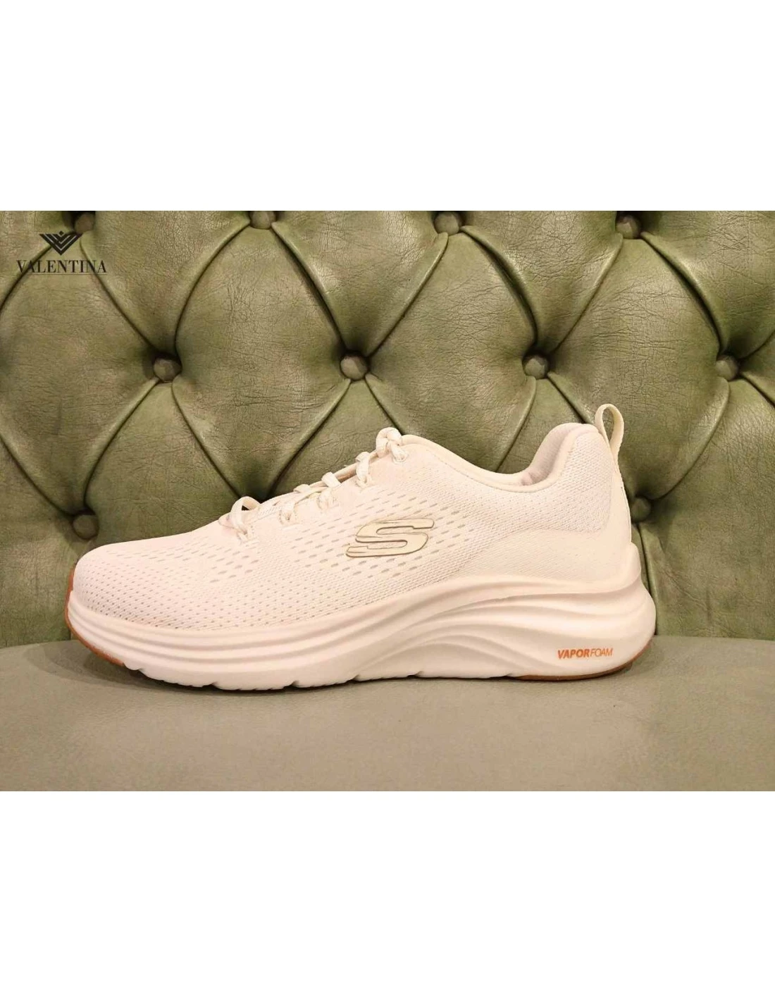 Skechers da donna scarpe leggere modello Vapor Foam: un memory foam leggerissimo. Sono scarpe in tessuto blu con suola bianca oppure tutte bianche oppure tutte nere. Linea Vegan di Skechers, queste scarpe sono anche lavabili in lavatrice.