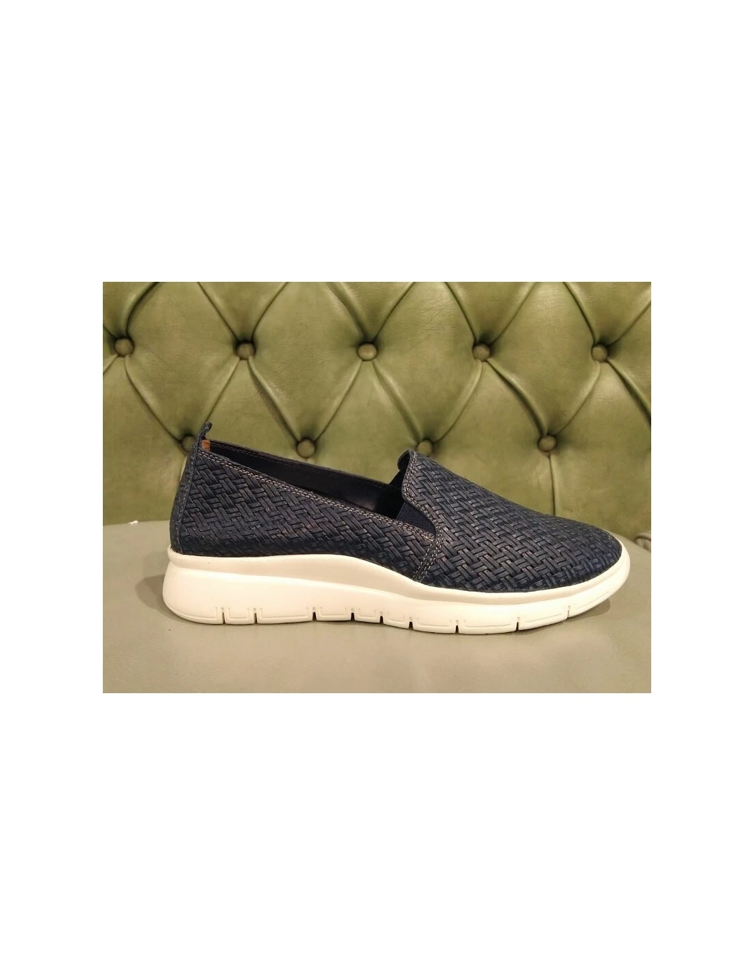 Scarpe da donna estive chiuse. Mocassini accollati leggeri e morbidi, in bella pelle intrecciata blu. Suola in gomma bianca e plantare estraibile. Scarpe chiuse per un outfit casual da città. Disponibili anche grigie.