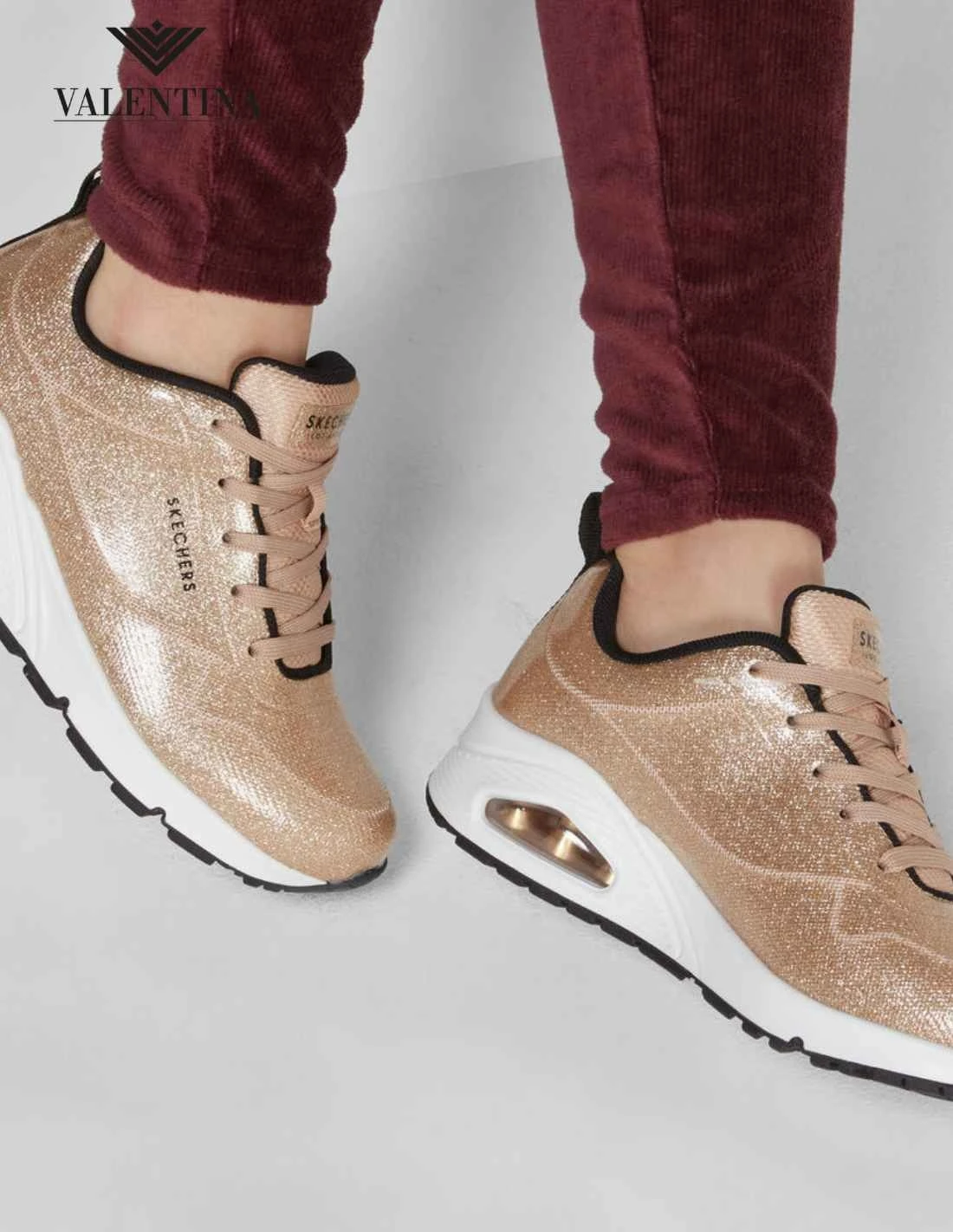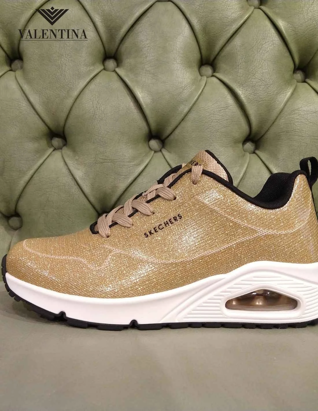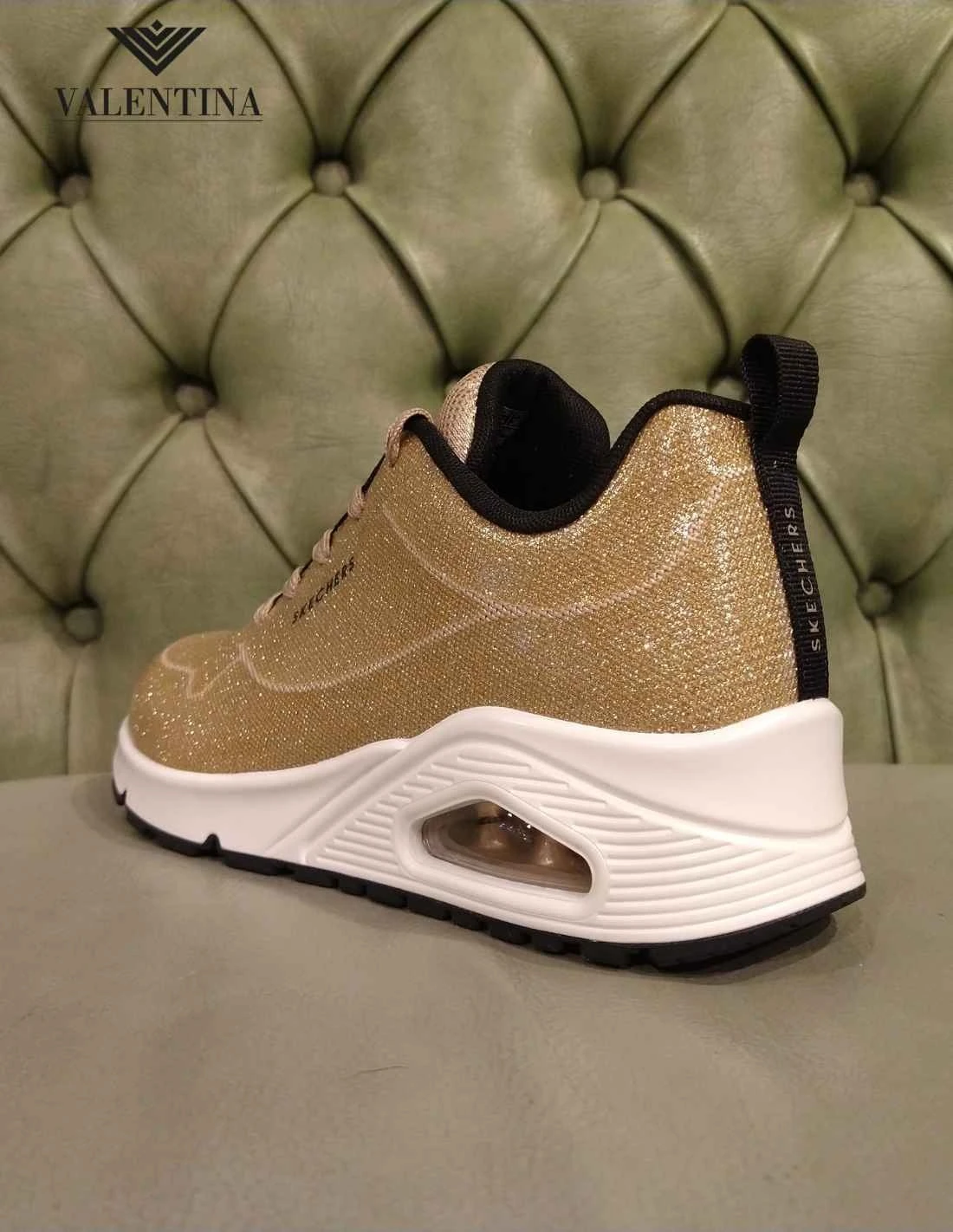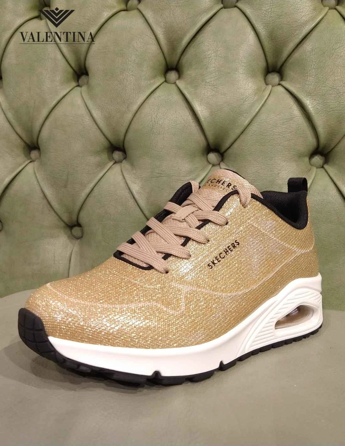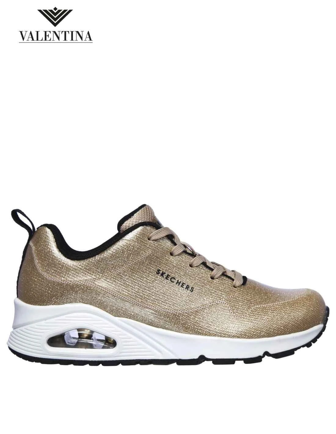 Le Skechers Uno in versione Diamond Shatter, color oro, tutte glitterate e luminose. Scarpe sportive di moda con una tomaia ultra leggera in tessuto resistente. Plantare con air memory foam, suola in gomma e tallone rialzato. Scarpe allacciate, linea da città di Skechers.