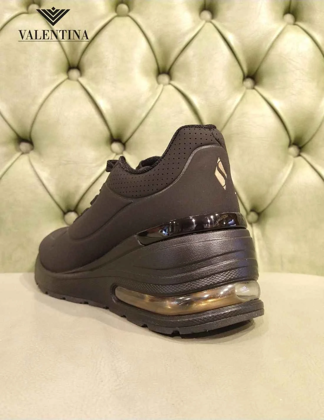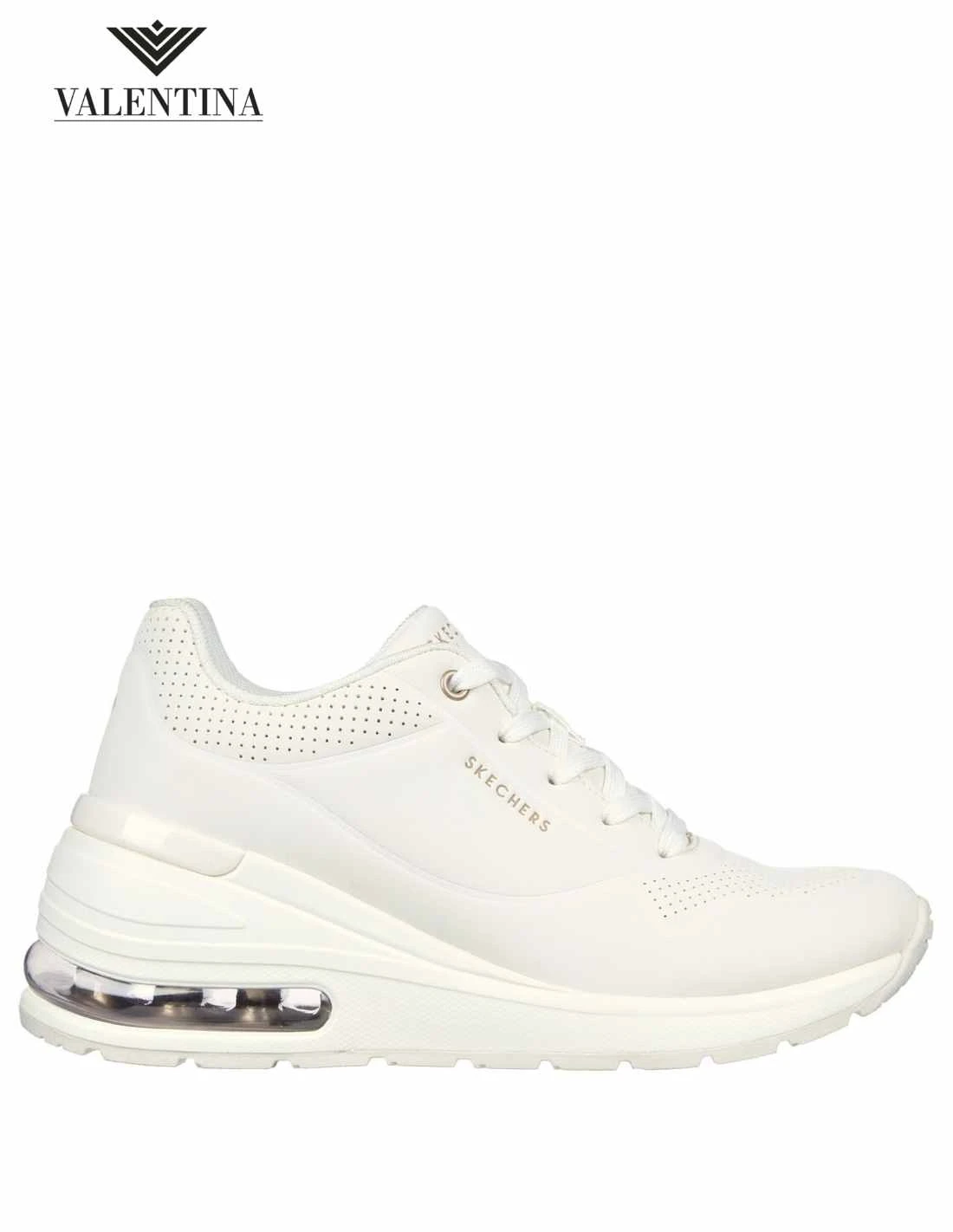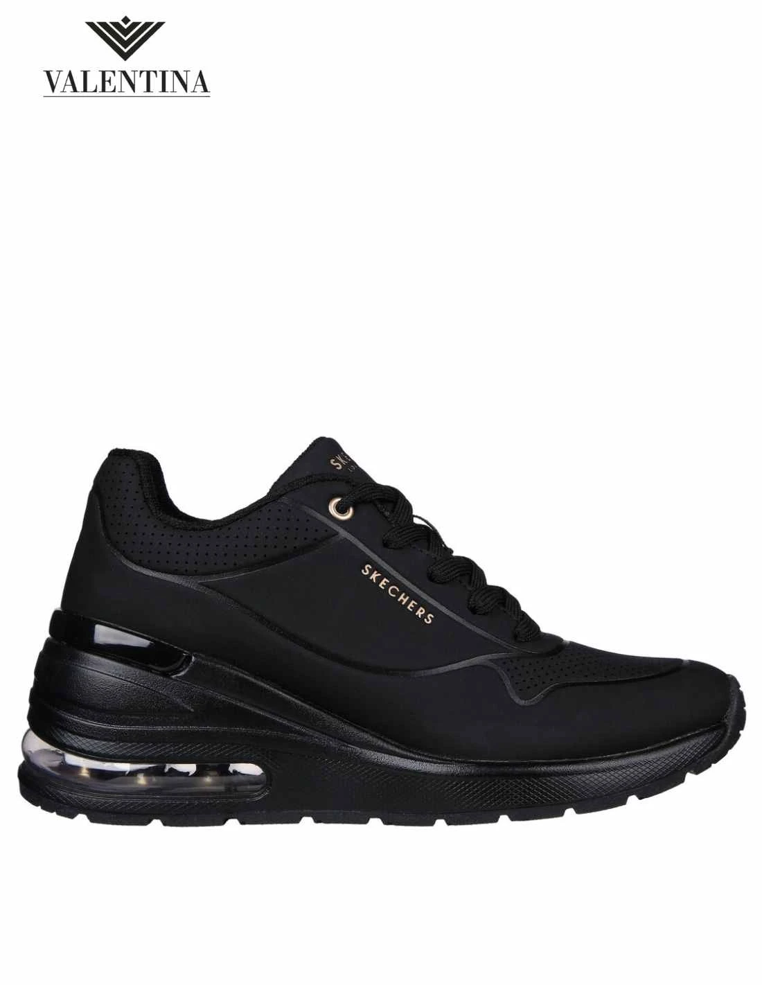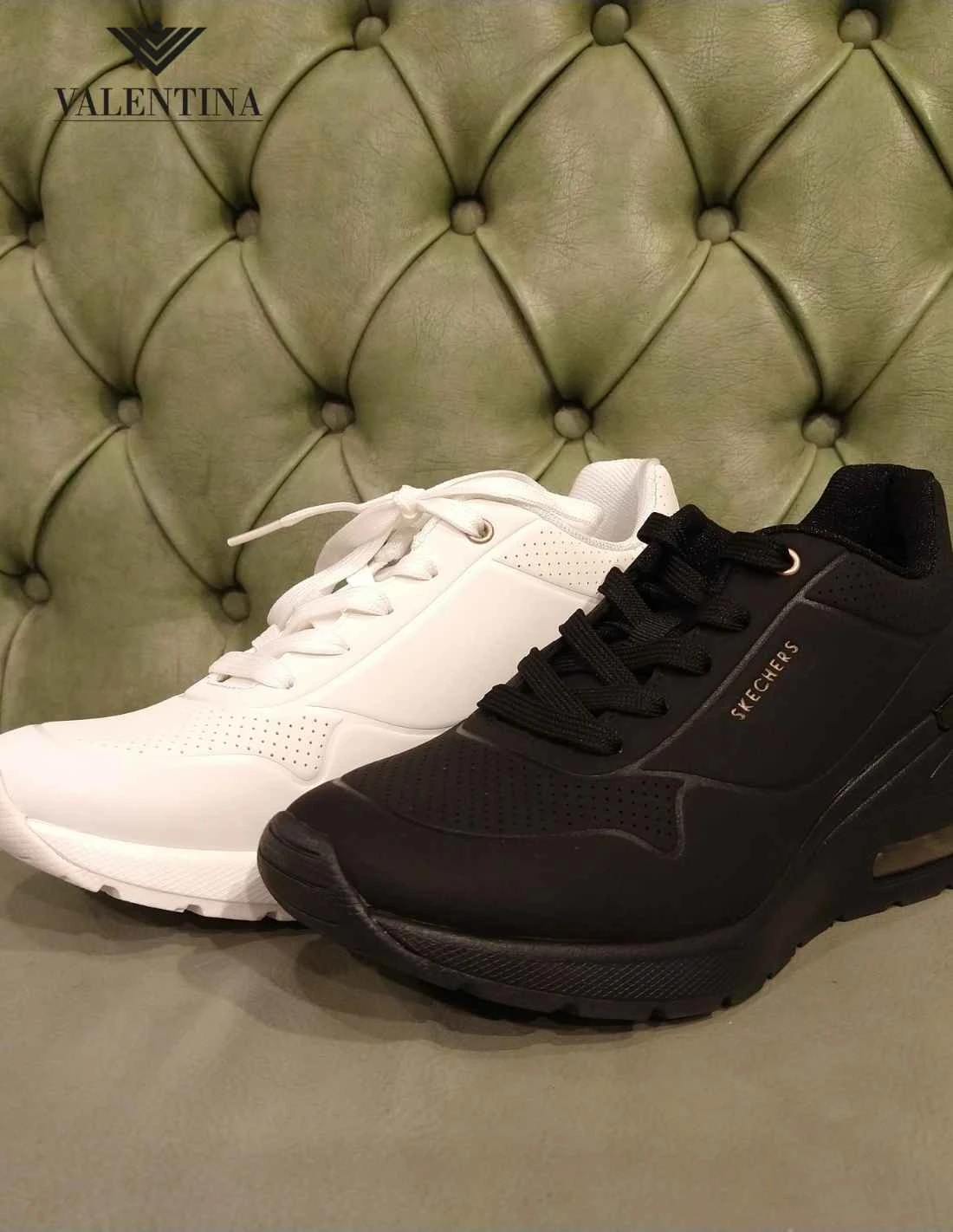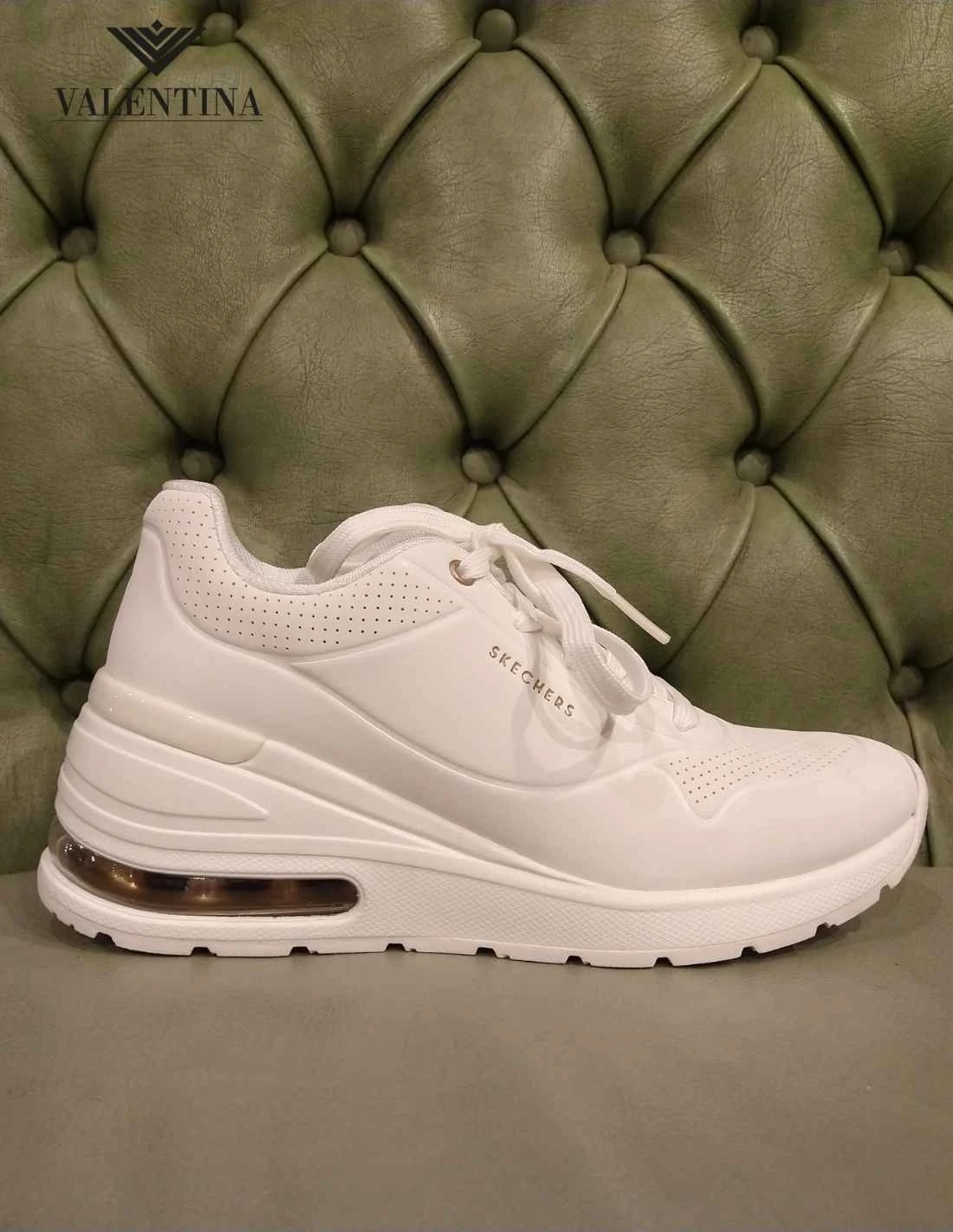 Le Skechers Million Air sono scarpe da ginnastica con la zeppa che dà un’altezza al tallone complessiva di 6 cm. Per il resto sono fatte come le clessiche Skechers: in pelle ecologica resistente e leggera durabuck, plantare in memory foam e cuscinetto d’aria Skech Air al tallone. Disponibili nere o bianche