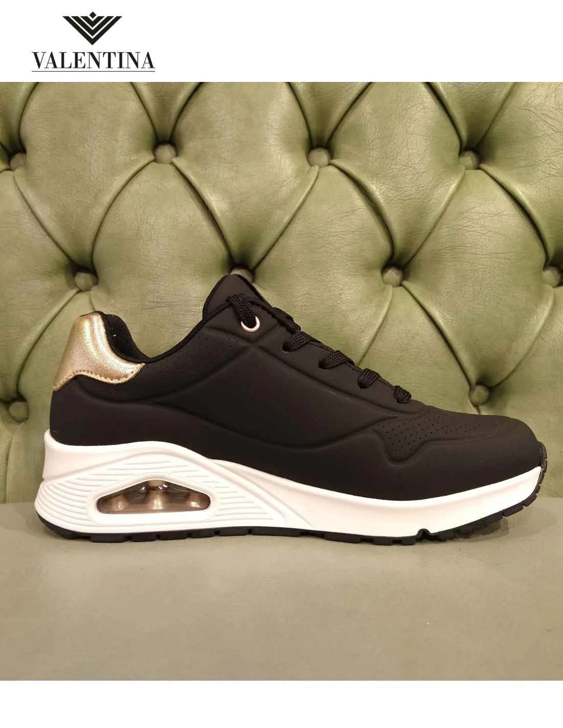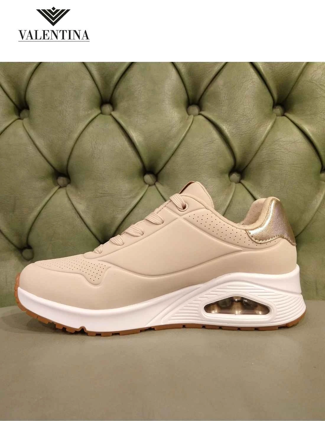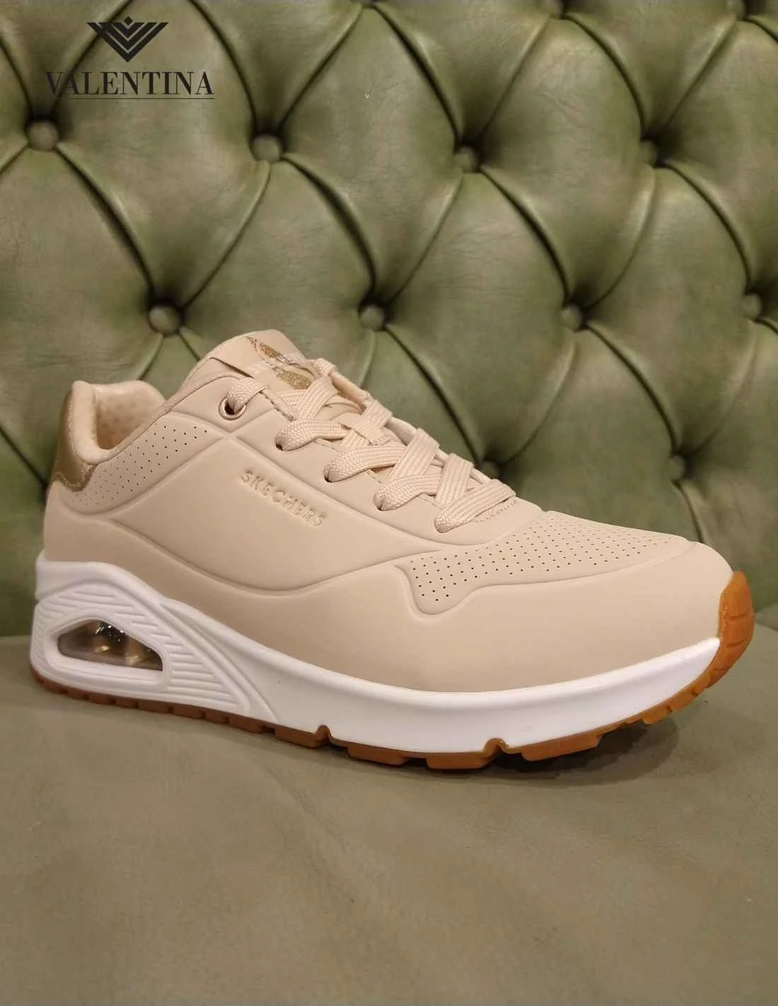 Sneakers da donna della Skechers line street, modello Uno Golden Air. In ecopelle Durabuck, morbida e resistente. Le Skechers del tipo Uno sono una linea con cuscinetto d’aria sotto al tallone, che è anche rialzato di 2,5 cm. Air cooled memory foam e allacciate, sono sneakers moda per la stagione invernale.