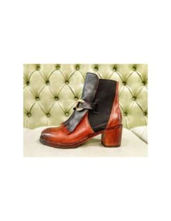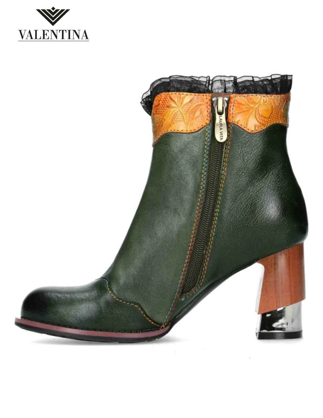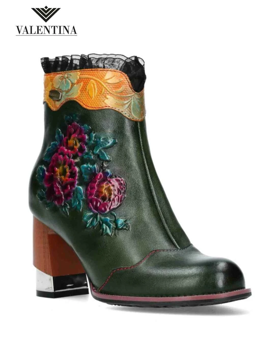 Particolari stivaletti con tacco 8 cm decorato in pelle e metallo. Fatto in pelle, hanno una decorazione floreale su un lato, hanno il bordo della caviglia smeralata con pizzo nero e sono chiusi da cerniera laterale. Disponibili colore verde o rosso, sono stivaletti molto particolari con un tacco stupendo decorato, stabile e comodo.