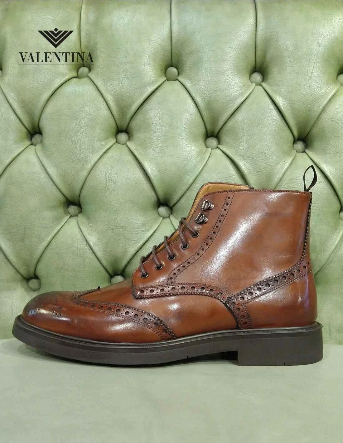 Stivaletti da uomo made in Italy, in vitello delavé color brandy, colorati con tecniche artigianali. I polachini sono alti alla caviglia, allacciati derby e con cerniera laterale. Fatti in vera pelle genuina con effetto vintage. Suola in gomma. Decorazione coda di rondine all’inglese.
