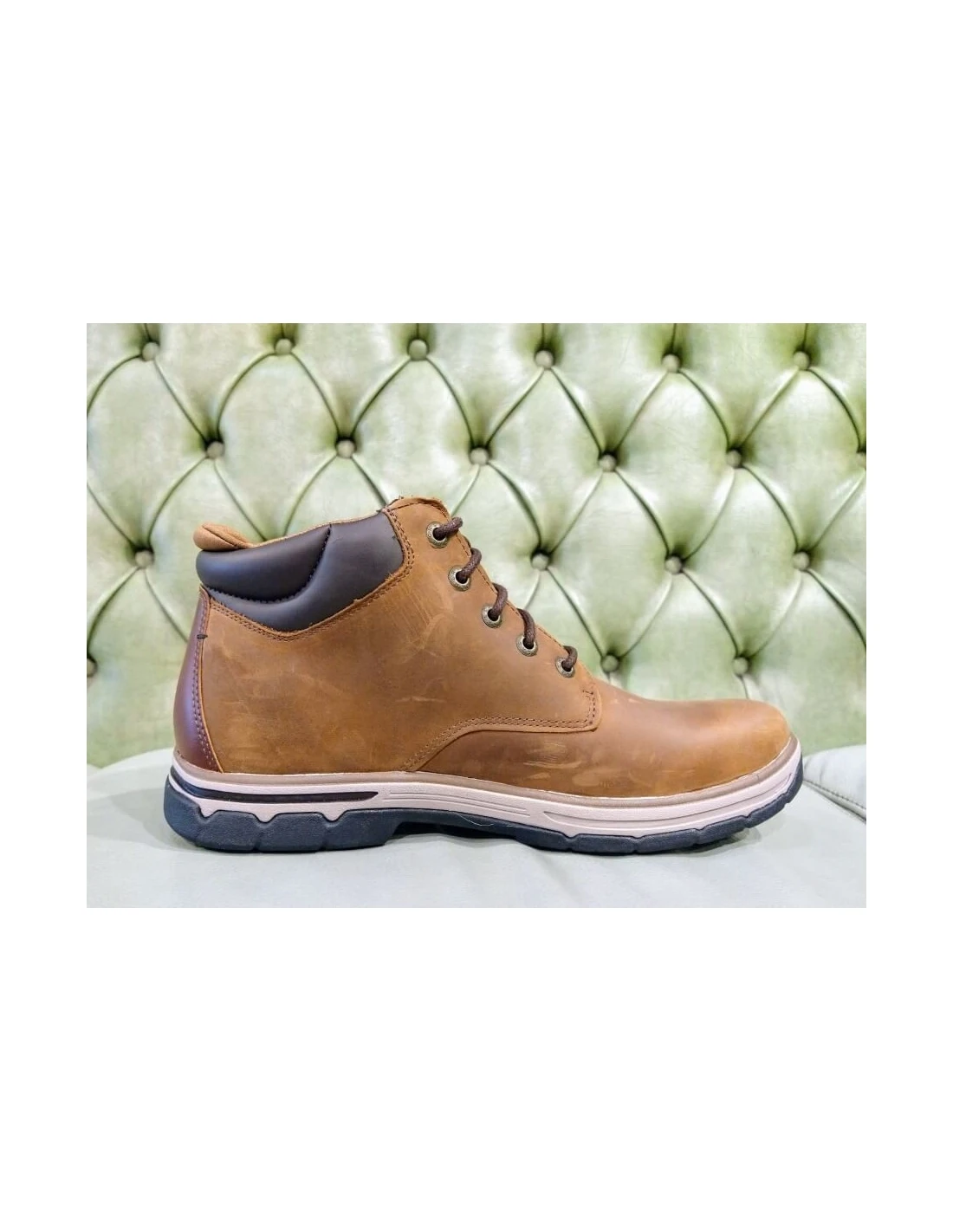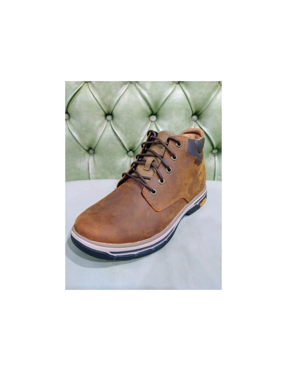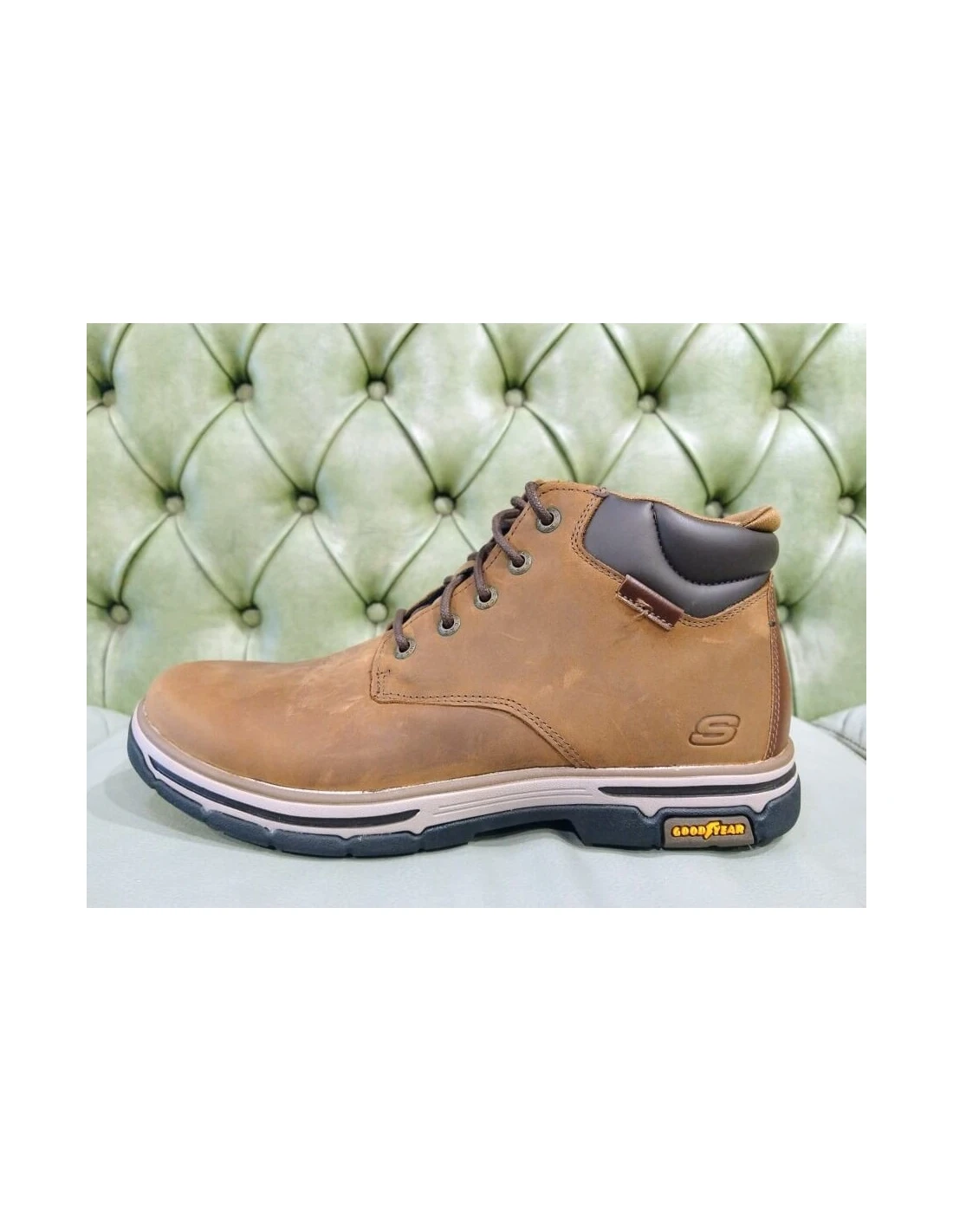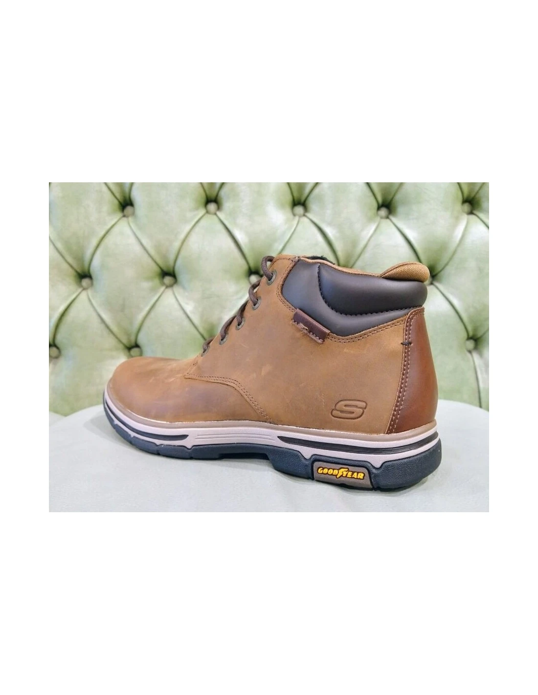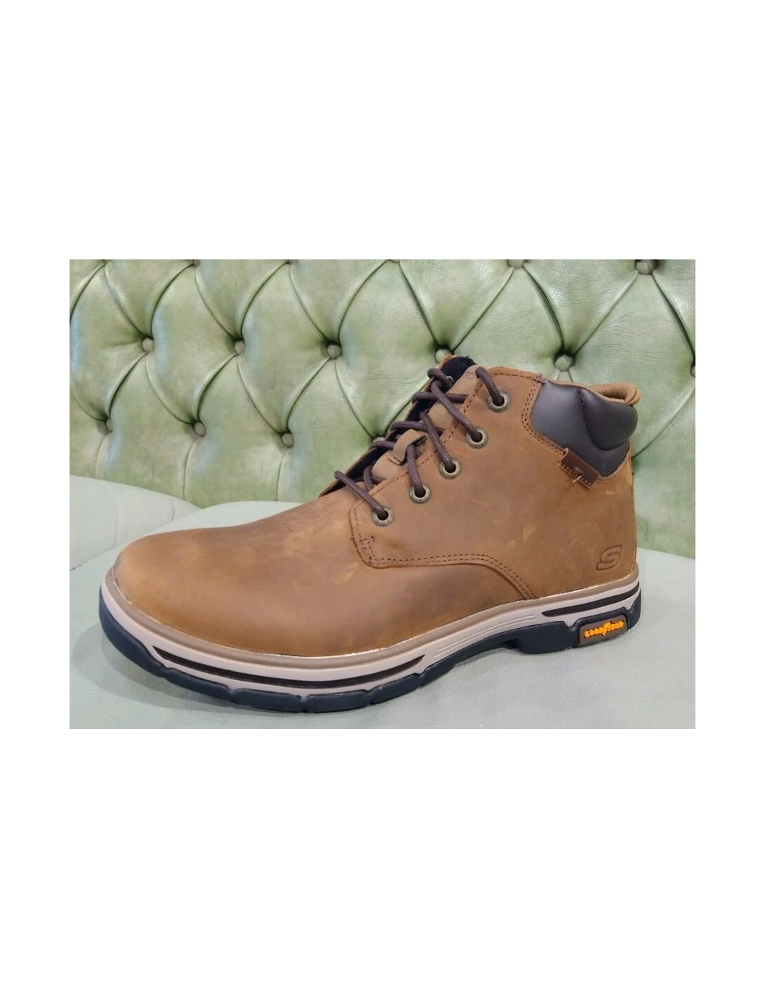 Sivaletti da uomo Skechers allacciati in pelle ingrassata impermeabile, colore marrone oppure nero. Forma ampia della linea Relaxed Fit, e soletta interna con Air Cooled Memory Foam, La suola è in gomma Goodyear, leggera e performante.
