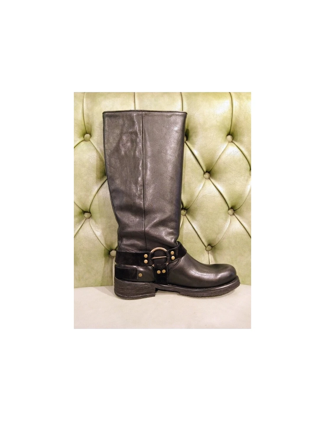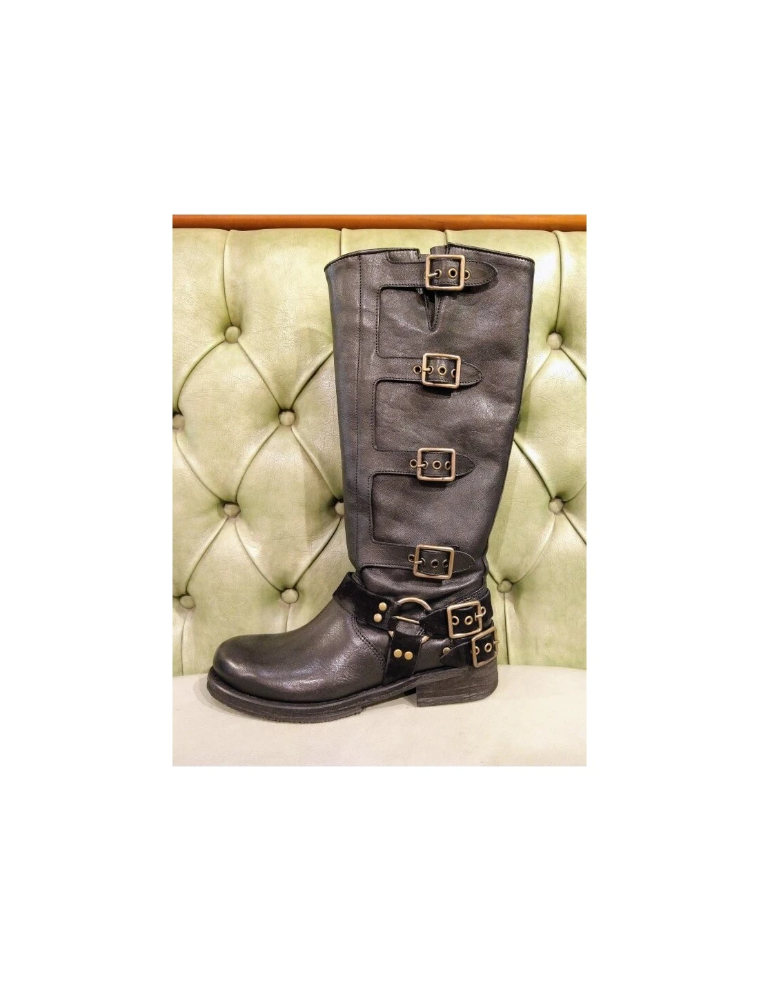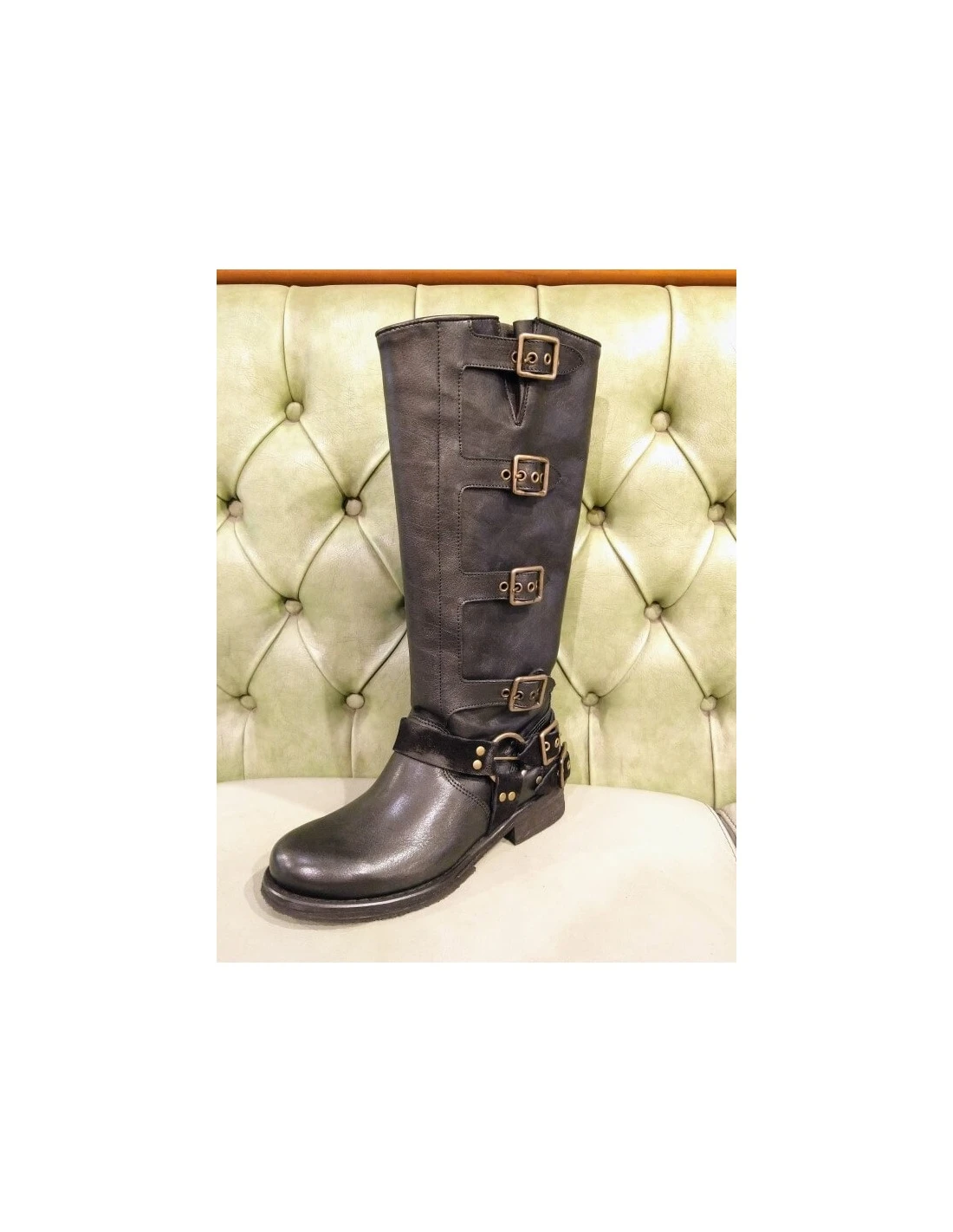 Calzature invernali, stivali alti con fibbie decorative, in pelle nera colorata a mano, con tacco basso e largo di forma. Con suola in gomma Felmini sono senza cerniera, in stile slouch. Look sportivo casual, completamente nero, reso particolare dalle fibbie decorative e dai passanti scamosciati sul piede.