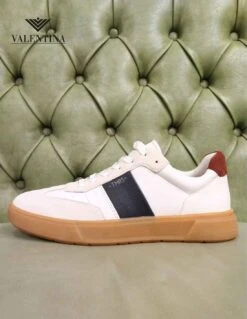Sneakers da uomo basse estive. Scarpe in pelle colore bianco con una banda blu centrale oppure colore blu con una striscia bianca centrale. Scarpe in stile sneaker classica, basse alla caviglia, con allacciatura lunga. Plantare estraibile e dalla forma anatomica. La suola è tutta pari, a cassetta, e colore gomma naturale.
