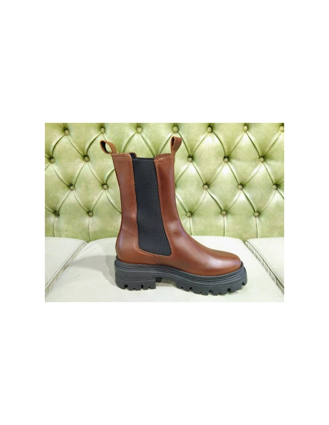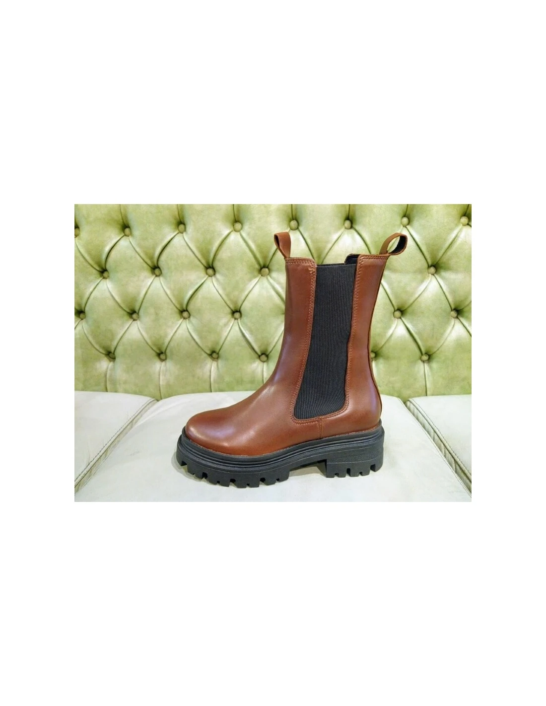 Scarpe da donna, senza cerniera, con bande elastiche ai lati, stile beatles casual. Altezza tre quarti (20,5 cm dal tallone), sono particolari, comodi e versatili. Fatti in pelle, hanno la suola in gomma in gomma carrarmata con platform. Tacco comodo 4,5 cm e plantare estraibile.