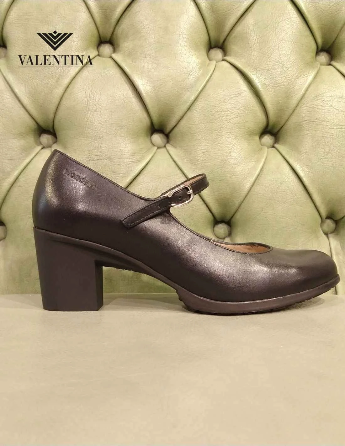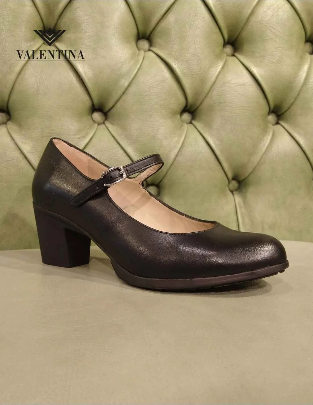 Décolleté nere comode con tacco largo e laccetto sul piede tipo mary jane. Il tacco è 6 cm con forma larga comoda molto stabile. I decolté sono fatti interamente in pelle morbida e sono foderati in pelle. Suola in gomma. Nella suola cuscinetto morbido per una calzata comoda.